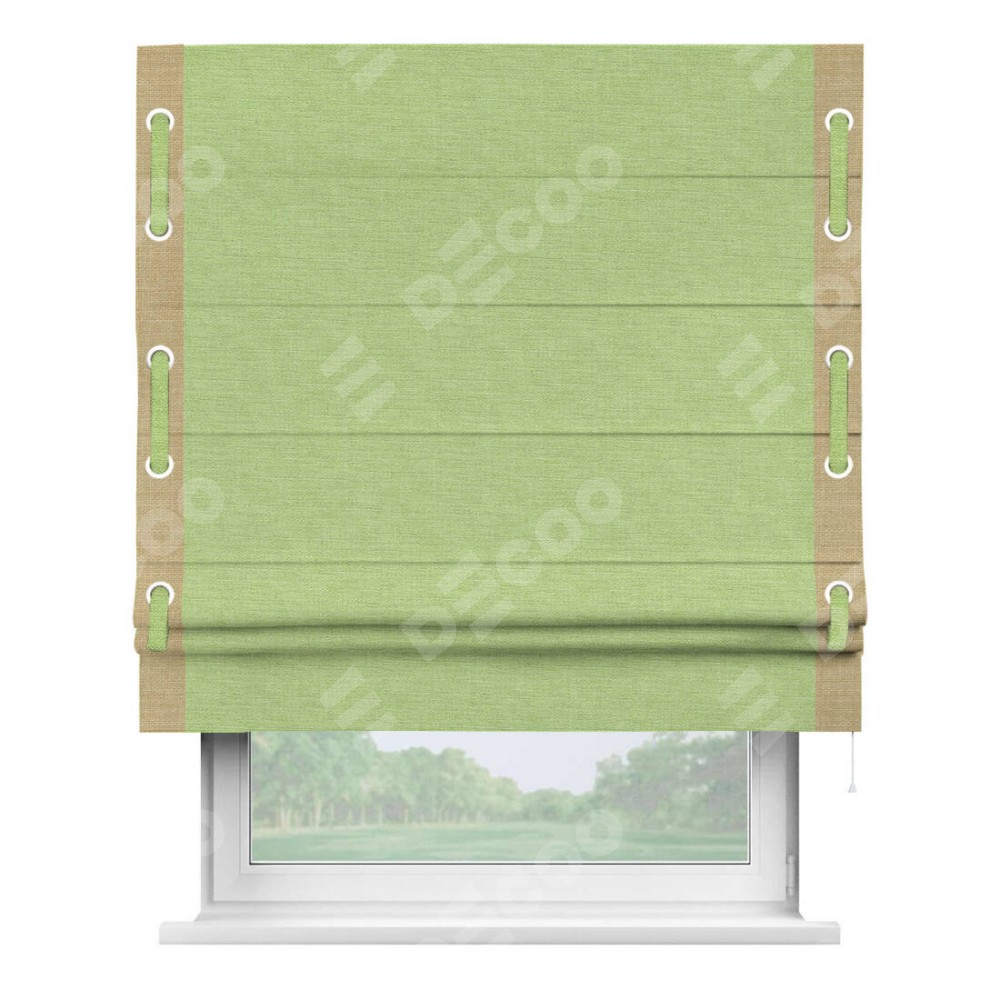Римская штора производителя «Cortin», используется для проёма, пошита из ткани лён зеленый, артикул 85906. Отделка шторы кантом «Стрим Дуо» на кантах расположены люверсы с пояском, ткань для канта используется из льна разной расцветки на выбор. Ткань для пояска обычно используется из основной ткани шторы, а так же можно сделать из любой расцветки по желанию. Имеет универсальный механизм и подходит для монтажа: на потолок, на стену и в нишу.