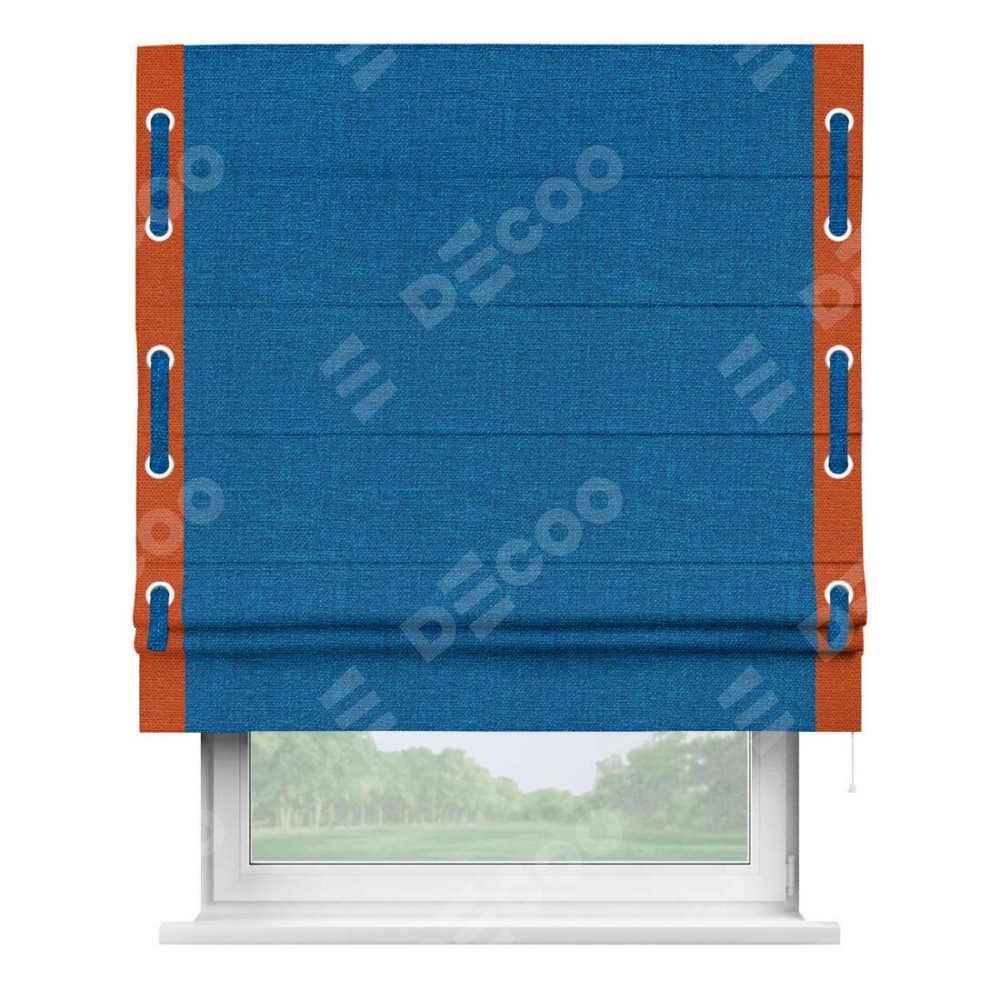 Римская штора производителя «Cortin», используется для проёма, пошита из ткани лён синий, артикул 63742. Отделка шторы кантом «Стрим Дуо» на кантах расположены люверсы с пояском, ткань для канта используется из льна разной расцветки на выбор. Ткань для пояска обычно используется из основной ткани шторы, а так же можно сделать из любой расцветки по желанию. Имеет универсальный механизм и подходит для монтажа: на потолок, на стену и в нишу.