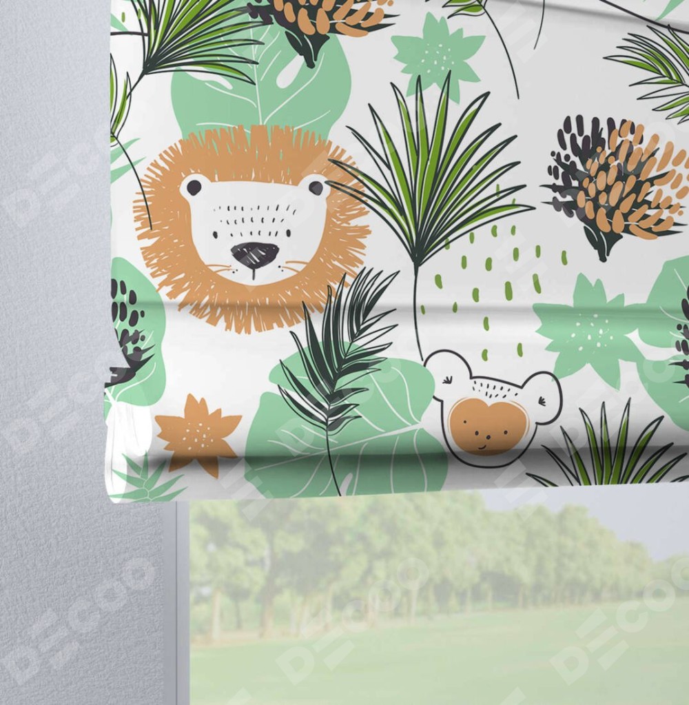 Римская штора производителя «Cortin», используется для проёма, пошита из ткани блэкаут с нанесением сублимационной печати «Животные из джунглей». Данная модель пошита на петлях, комплектуется на выбор круглым карнизом и подходит для монтажа на стену. Римская штора на петлях имеет простую систему регулировки высоты, отличительным преимуществом данной модели является простой способ монтажа. Достаточно повесить ее на трубу и штора готова!