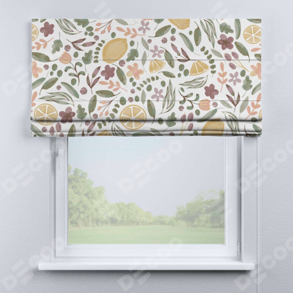 Римская штора «Кортин» для проема «Лимоны и цветы» отлично подойдёт для интерьера: в кухню и на балкон.