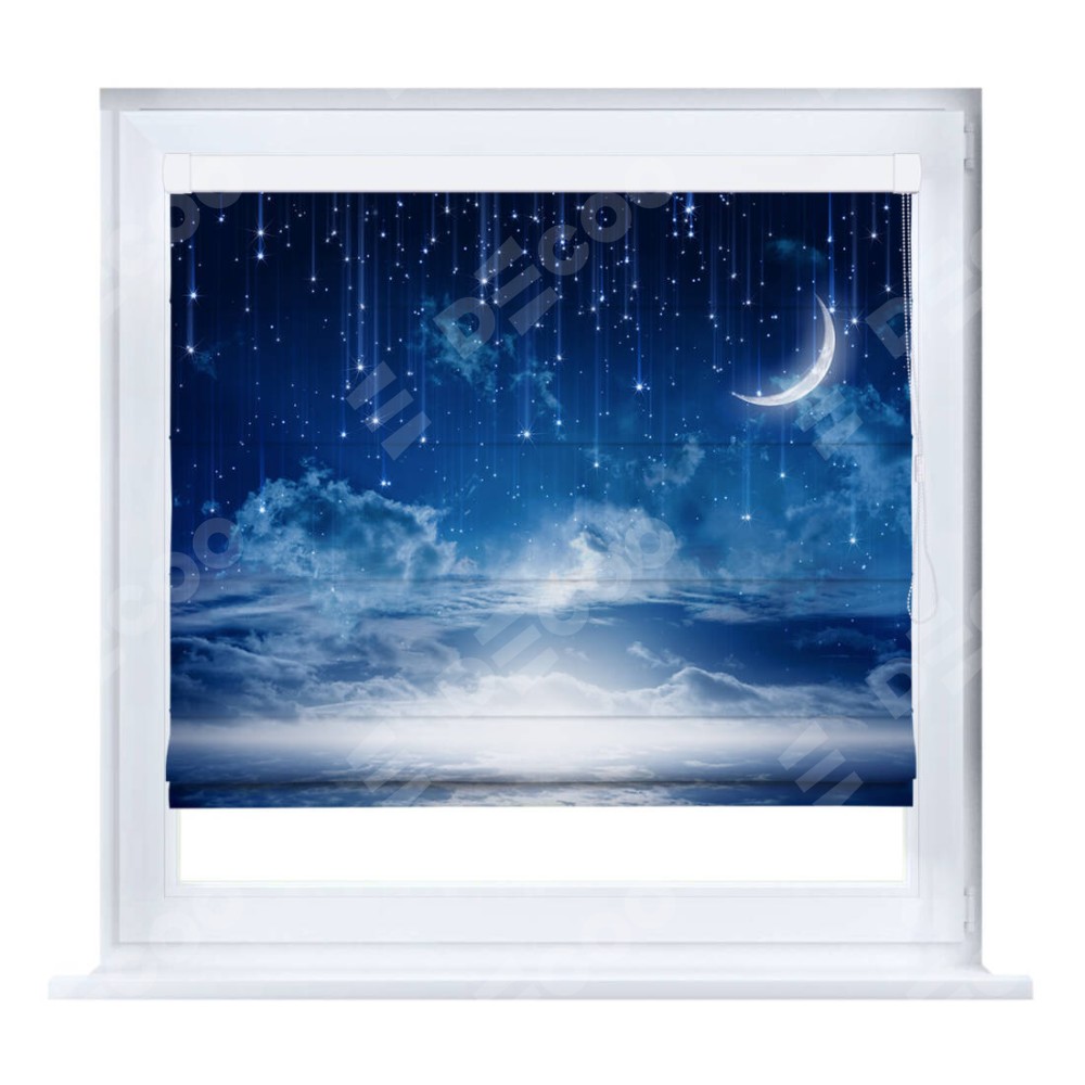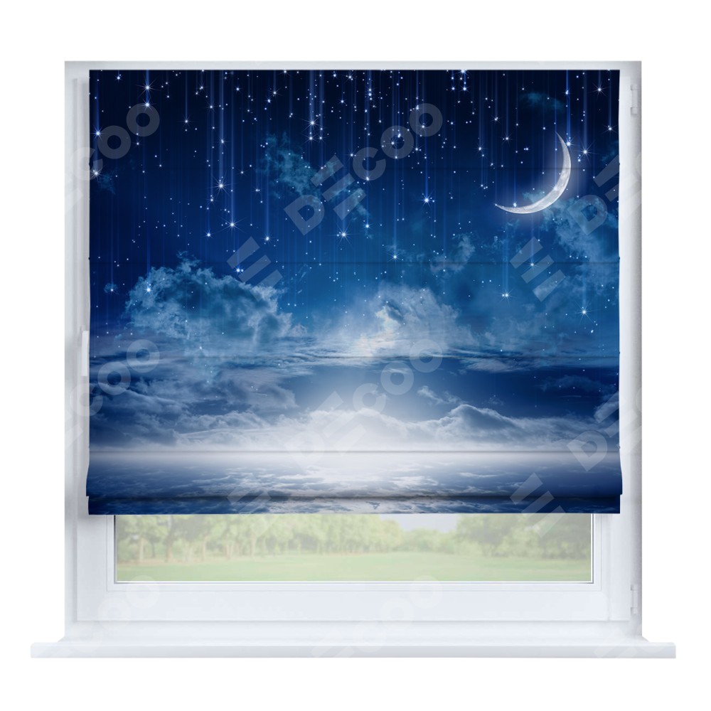 Римская штора производителя «Cortin», устанавливается на створку окна, пошита из ткани блэкаут с нанесением сублимационной печати «Ночное небо». Штора шьётся по индивидуальным размерам, для данного типа римской шторы возможная ширина от 35 до 150 см., высота до 250 см.