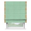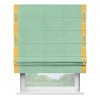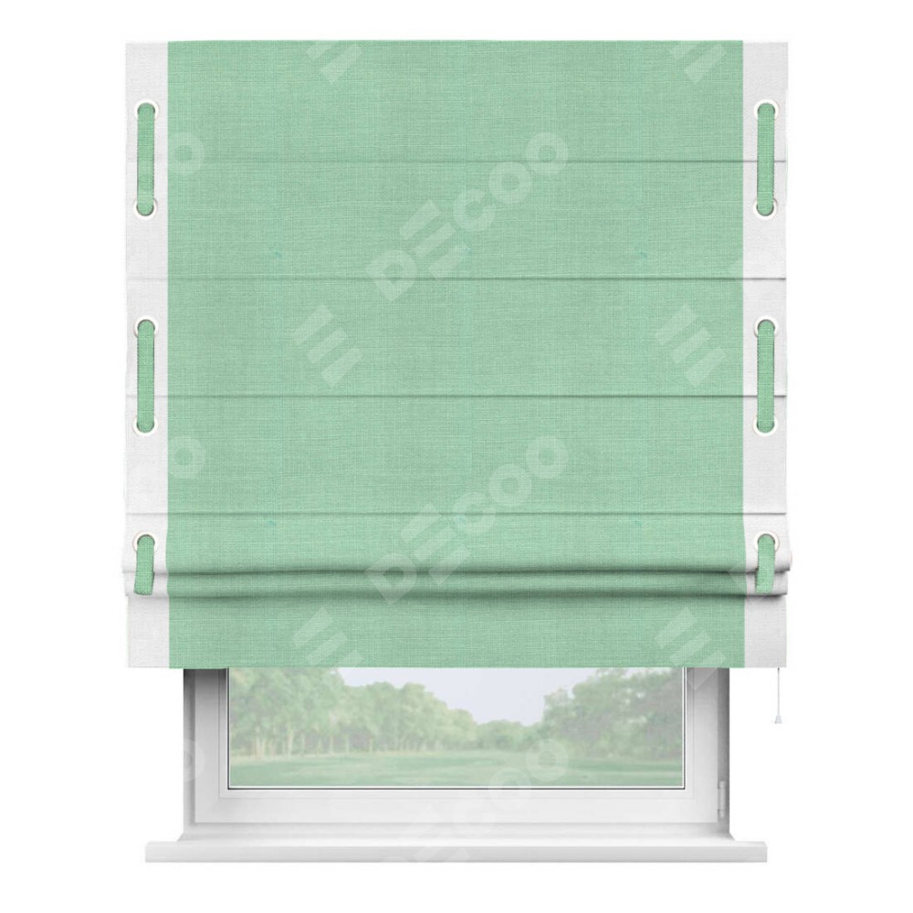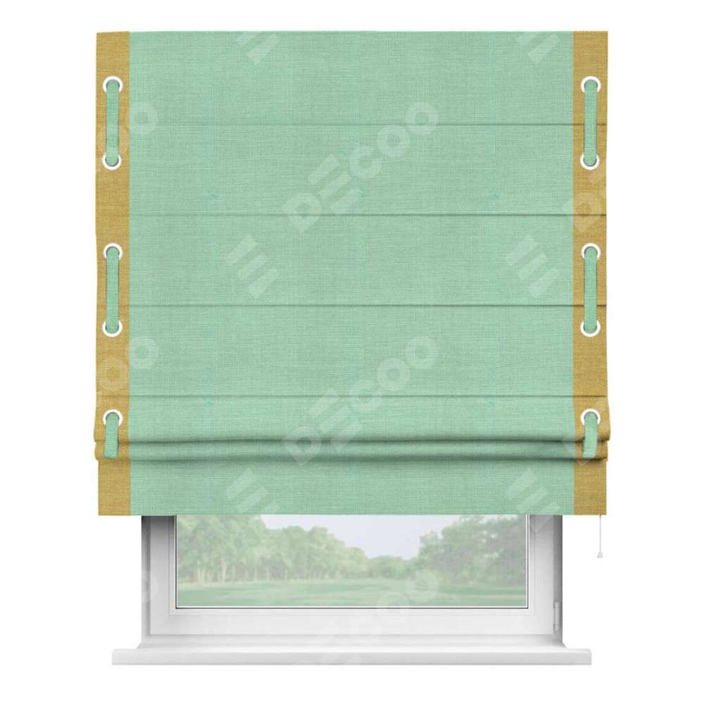 Римская штора производителя «Cortin», используется для проёма, пошита из ткани лён светло-бирюзовый, артикул 74737. Отделка шторы кантом «Стрим Дуо» на кантах расположены люверсы с пояском, ткань для канта используется из льна разной расцветки на выбор. Ткань для пояска обычно используется из основной ткани шторы, а так же можно сделать из любой расцветки по желанию. Имеет универсальный механизм и подходит для монтажа: на потолок, на стену и в нишу.