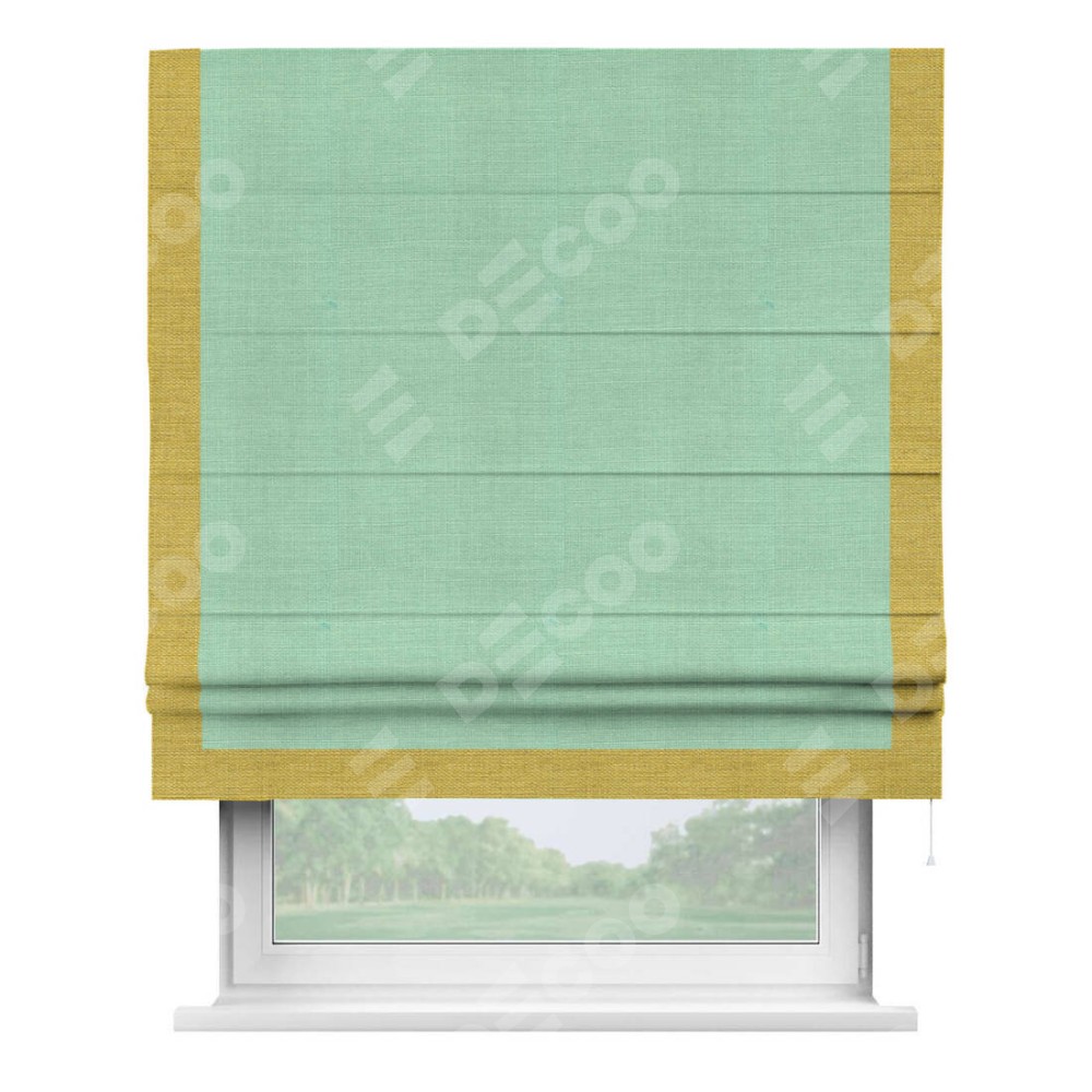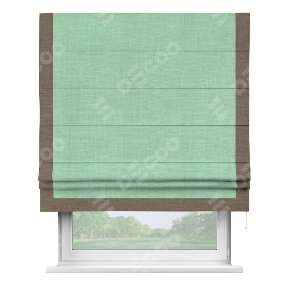 Римская штора производителя «Cortin», используется для проёма, пошита из ткани лён светло-бирюзовый, артикул 74737. Отделка шторы кантом «Виктория», ткань для канта используется из льна разной расцветки на выбор. Имеет универсальный механизм и подходит для монтажа: на потолок, на стену и в нишу.