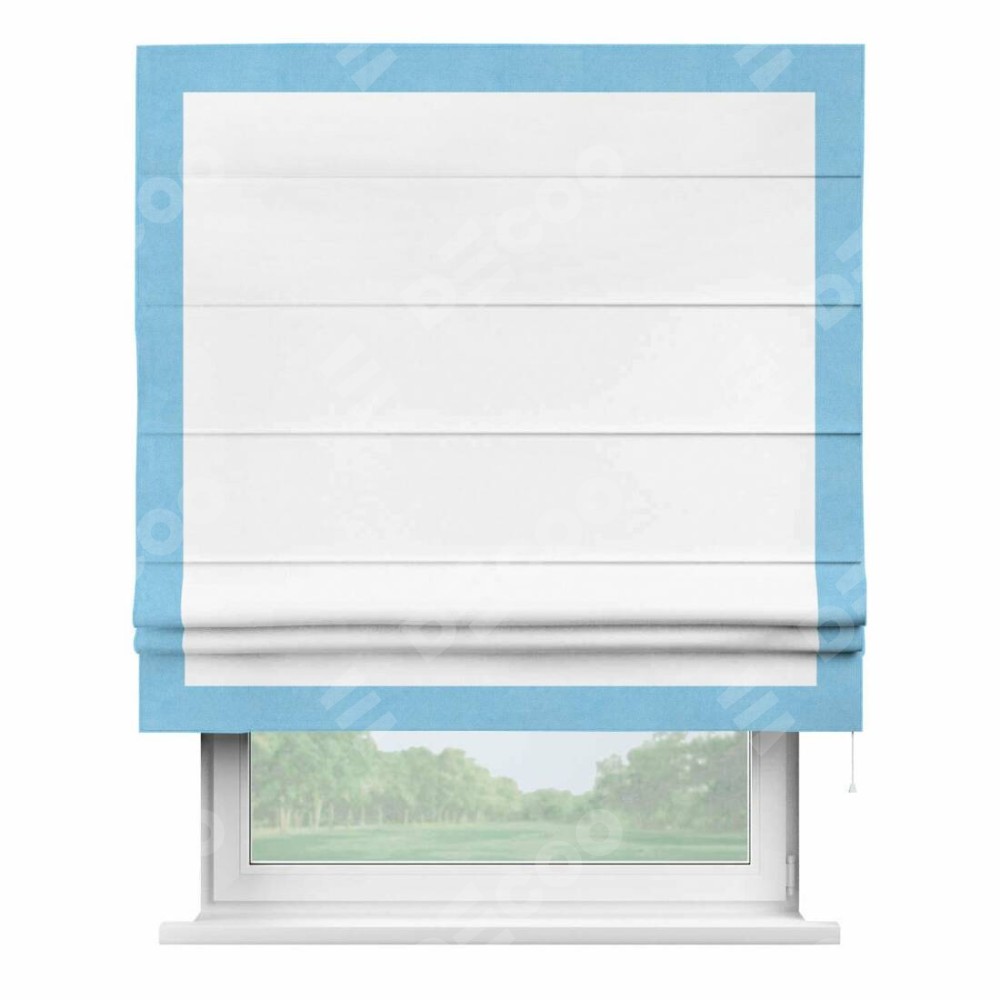 Римская штора производителя «Cortin», используется для проёма, пошита из ткани вельвет белоснежный, артикул ткани 19192. Отделка шторы кантом «Чесс», ткань для канта используется из вельвета разной расцветки на выбор. Имеет универсальный механизм и подходит для монтажа: на потолок, на стену и в нишу.