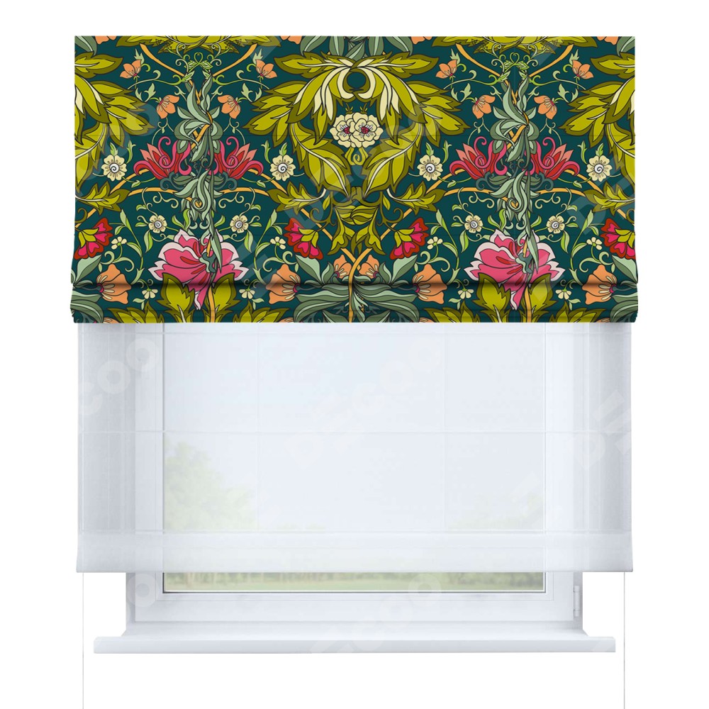 Римская штора день-ночь производителя «Cortin», используется для проёма, пошита из двух полотен, с лицевой блэкаут с нанесением сублимационной печати «Цветок морриса», вторая ткань тюль (по стандарту комплектуется тюль белого цвета артикул V-01). Имеет универсальный механизм и подходит для монтажа: на потолок, на стену и в нишу.
