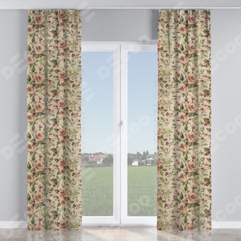 Комплект прямых штор, от производителя «Cortin», пошиты из ткани «Розы бежевые», артикул ткани 34564. С изнаночной стороны в верхней части штор пристрачивается шторная лента с декоративными складками «Кустик». Для создания элегантных складок прямые шторы шьются по стандарту с коэффициентом 1:2 (на 100 см. ширины проёма 200 см. ширины ткани).