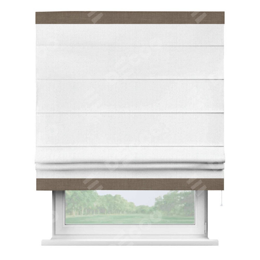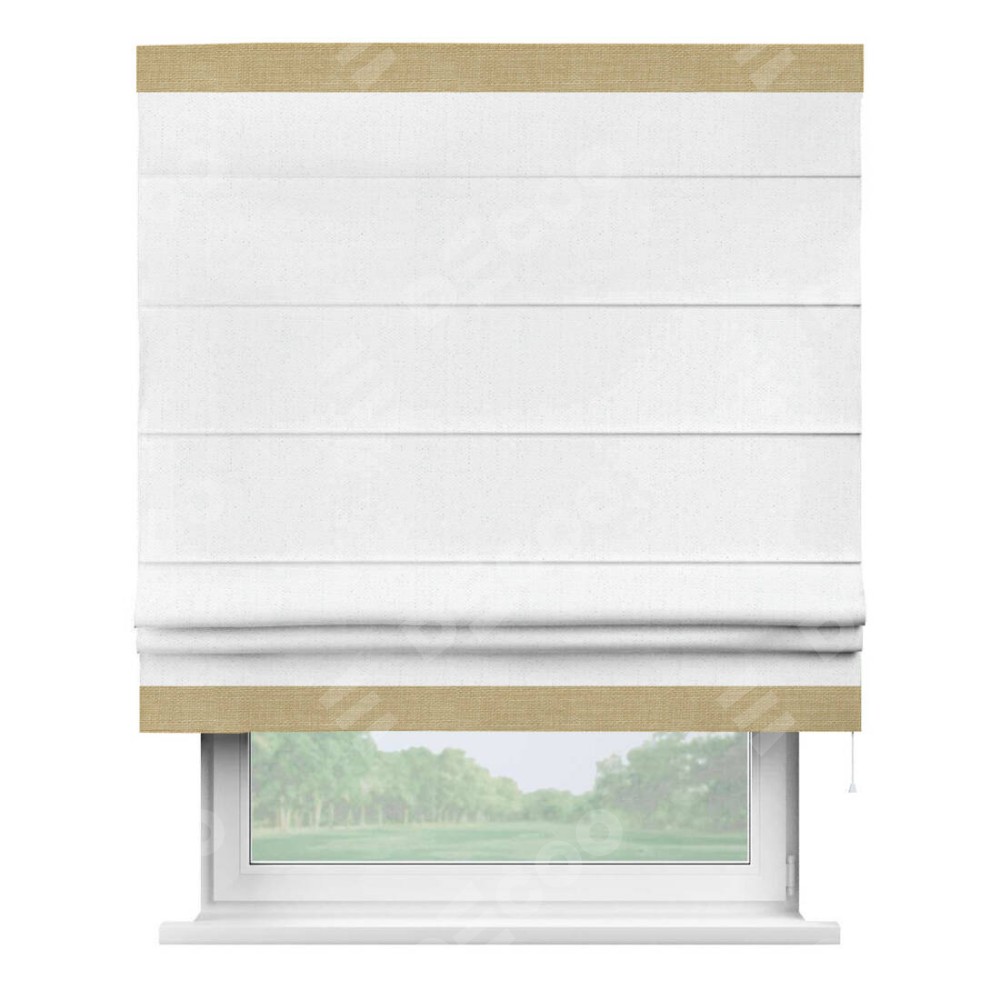 Римская штора производителя «Cortin», используется для проёма, пошита из ткани лён белоснежный, артикул 7438. Отделка шторы кантом «Горизонт», ткань для канта используется из льна разной расцветки на выбор. Имеет универсальный механизм и подходит для монтажа: на потолок, на стену и в нишу.
