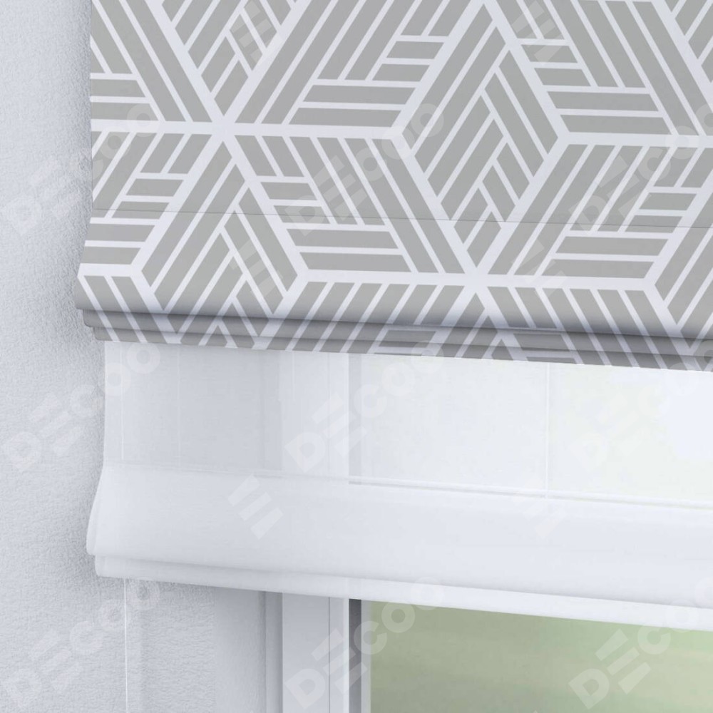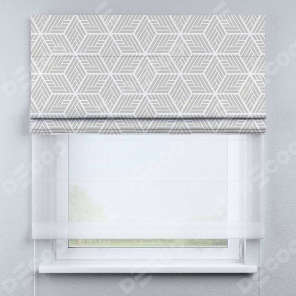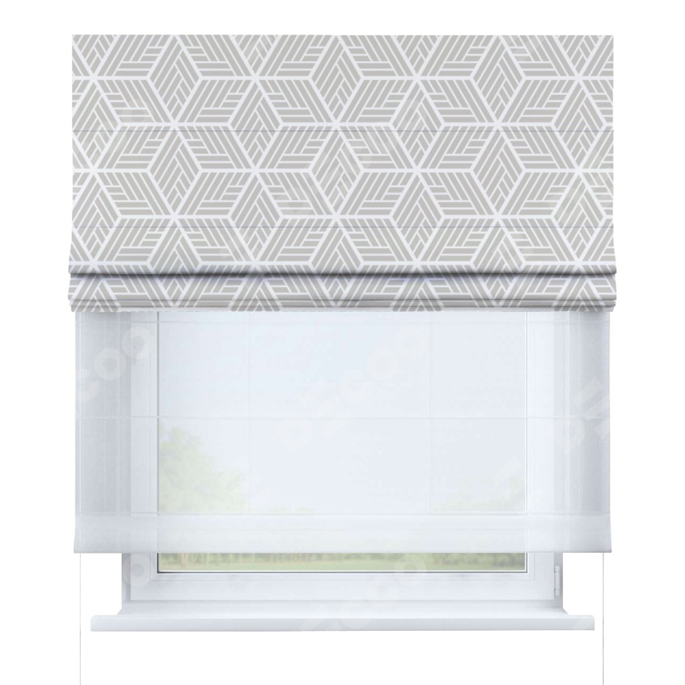 Римская штора день-ночь производителя «Cortin», используется для проёма, пошита из двух полотен, с лицевой блэкаут с нанесением сублимационной печати «Элемент», вторая ткань тюль (по стандарту комплектуется тюль белого цвета артикул V-01). Имеет универсальный механизм и подходит для монтажа: на потолок, на стену и в нишу.