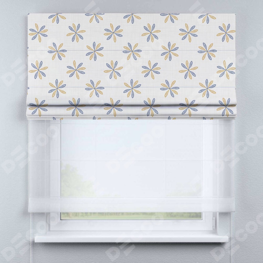 Римская штора день-ночь производителя «Cortin», используется для проёма, пошита из двух полотен, с лицевой блэкаут с нанесением сублимационной печати «Ромашки кантри», вторая ткань тюль (по стандарту комплектуется тюль белого цвета артикул V-01). Имеет универсальный механизм и подходит для монтажа: на потолок, на стену и в нишу.