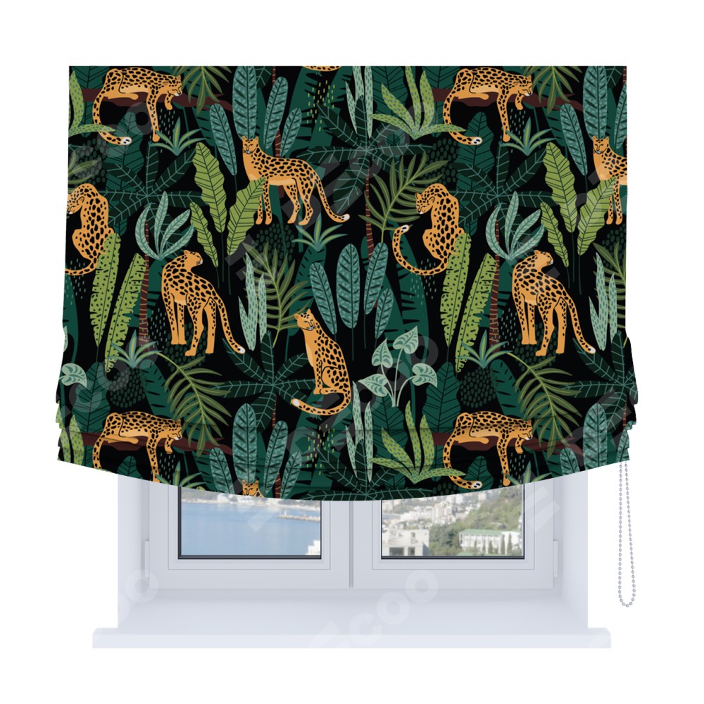 Римская штора Soft производителя «Cortin», используется для проёма, пошита из ткани блэкаут с нанесением сублимационной печати «Леопарды в джунглях». Имеет универсальный механизм и подходит для монтажа: на потолок, на стену и в нишу. В отличие от стандартных римских штор, римская штора Soft не имеет горизонтальных вставок и нижнего отвеса. Это позволяет ткани произвольно драпироваться в свободные мягкие складки.