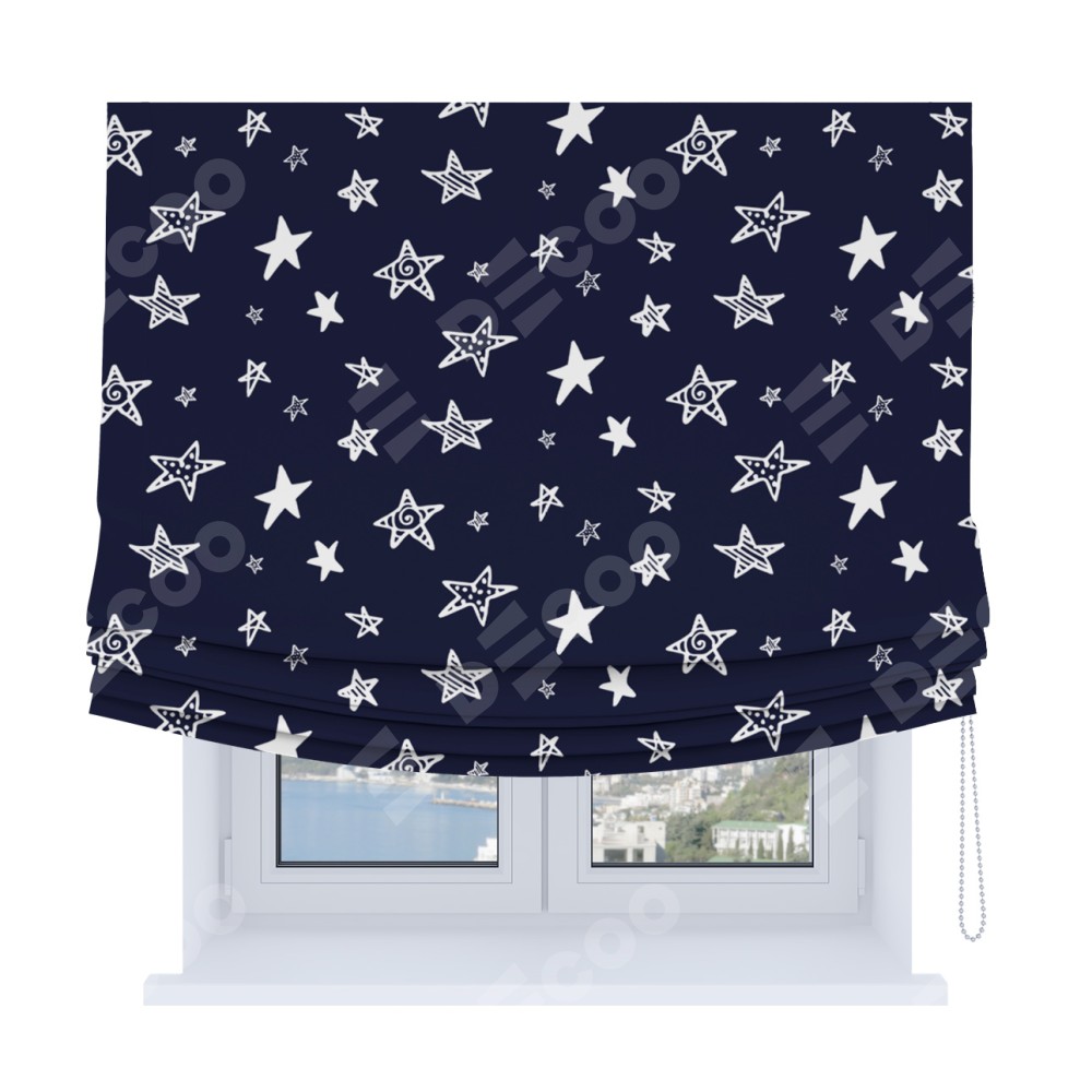 Римская штора Soft производителя «Cortin», используется для проёма, пошита из ткани блэкаут с нанесением сублимационной печати «Ночные звёзды». Имеет универсальный механизм и подходит для монтажа: на потолок, на стену и в нишу. В отличие от стандартных римских штор, римская штора Soft не имеет горизонтальных вставок и нижнего отвеса. Это позволяет ткани произвольно драпироваться в свободные мягкие складки.