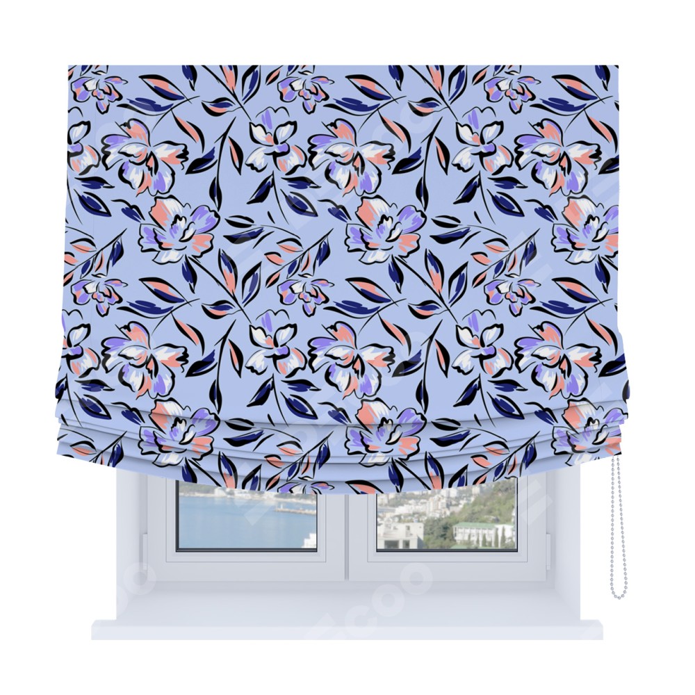 Римская штора Soft производителя «Cortin», используется для проёма, пошита из ткани блэкаут с нанесением сублимационной печати «Цветочки и листочки». Имеет универсальный механизм и подходит для монтажа: на потолок, на стену и в нишу. В отличие от стандартных римских штор, римская штора Soft не имеет горизонтальных вставок и нижнего отвеса. Это позволяет ткани произвольно драпироваться в свободные мягкие складки.