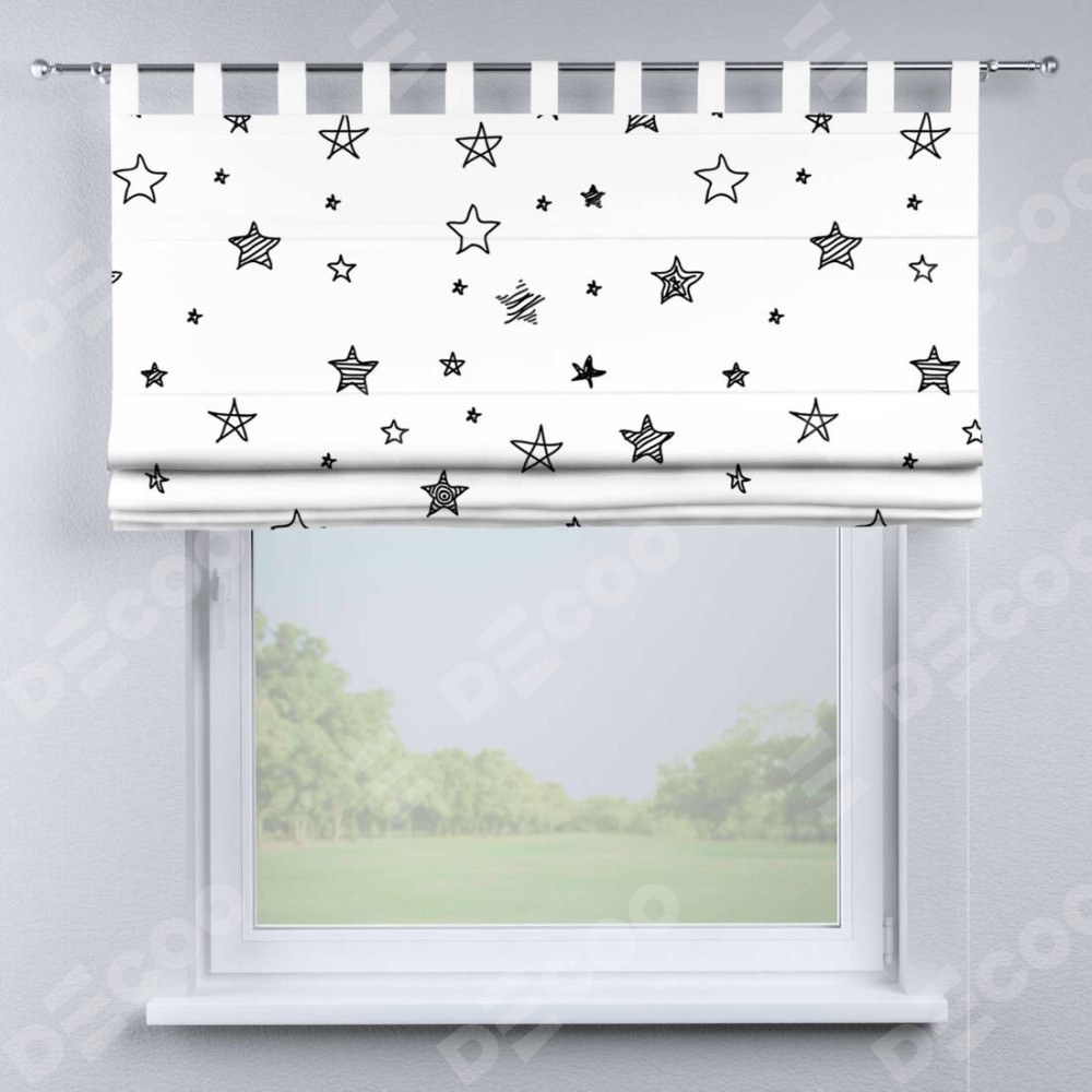 Римская штора производителя «Cortin», используется для проёма, пошита из ткани блэкаут с нанесением сублимационной печати «Звезды». Данная модель пошита на петлях, комплектуется на выбор круглым карнизом и подходит для монтажа на стену. Римская штора на петлях имеет простую систему регулировки высоты, отличительным преимуществом данной модели является простой способ монтажа. Достаточно повесить ее на трубу и штора готова!