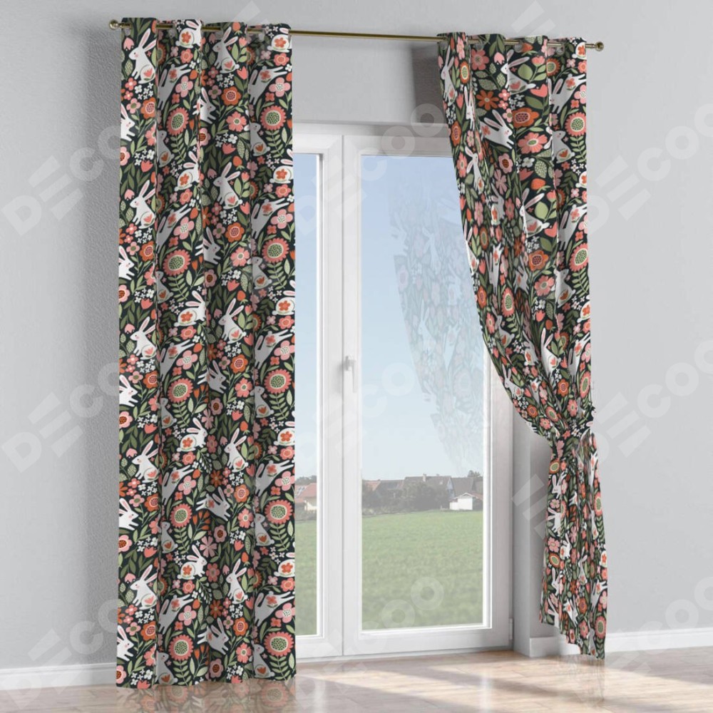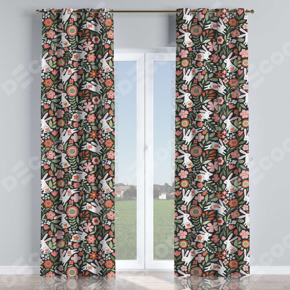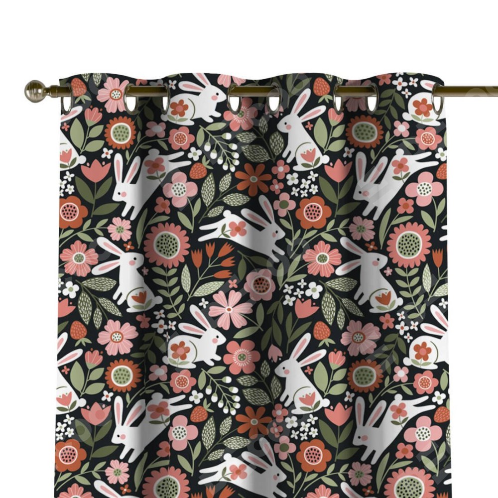 Комплект прямых штор, от производителя «Cortin», пошиты из ткани блэкаут с нанесением сублимационной печати «Зайчики в цветнике». Данная модель пошита на люверсах, комплектуется на выбор круглым карнизом и подходит для монтажа на стену или потолок. Прямые шторы на люверсах шьются по стандарту с коэффициентом 1/2 (на 100 см. ширины проёма 200 см. ширины ткани), отличительным преимуществом данной модели является простой способ монтажа. Достаточно повесить ее на трубу и штора готова!