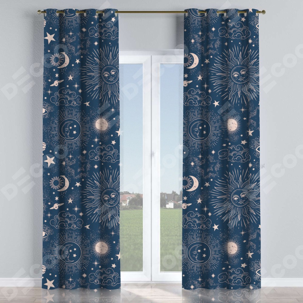 Комплект прямых штор, от производителя «Cortin», пошиты из ткани блэкаут с нанесением сублимационной печати «Звёзды и планеты». Данная модель пошита на люверсах, комплектуется на выбор круглым карнизом и подходит для монтажа на стену или потолок. Прямые шторы на люверсах шьются по стандарту с коэффициентом 1/2 (на 100 см. ширины проёма 200 см. ширины ткани), отличительным преимуществом данной модели является простой способ монтажа. Достаточно повесить ее на трубу и штора готова!