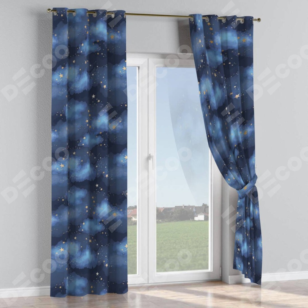 Комплект прямых штор, от производителя «Cortin», пошиты из ткани блэкаут с нанесением сублимационной печати «Золотые звёзды». Данная модель пошита на люверсах, комплектуется на выбор круглым карнизом и подходит для монтажа на стену или потолок. Прямые шторы на люверсах шьются по стандарту с коэффициентом 1/2 (на 100 см. ширины проёма 200 см. ширины ткани), отличительным преимуществом данной модели является простой способ монтажа. Достаточно повесить ее на трубу и штора готова!