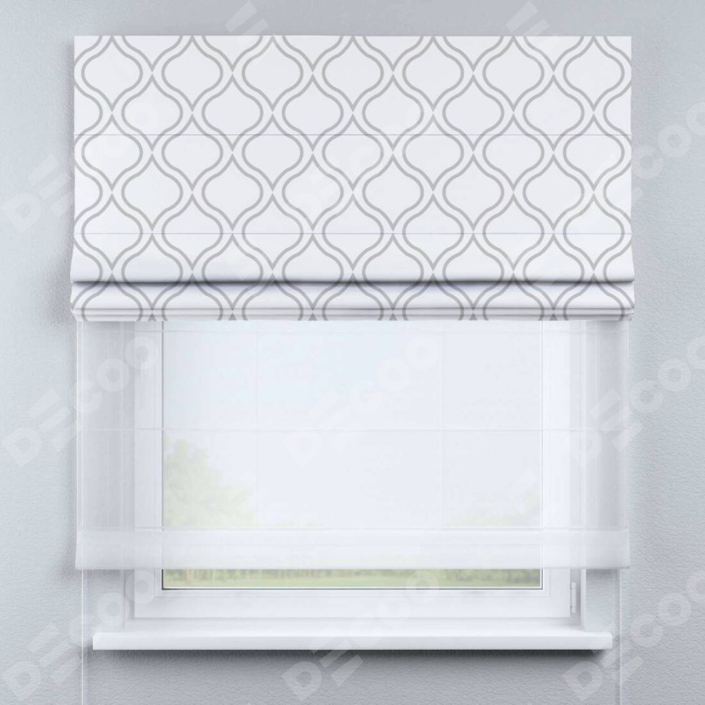 Римская штора день-ночь производителя «Cortin», используется для проёма, пошита из двух полотен, с лицевой блэкаут с нанесением сублимационной печати «Тайны востока белый», вторая ткань тюль (по стандарту комплектуется тюль белого цвета артикул V-01). Имеет универсальный механизм и подходит для монтажа: на потолок, на стену и в нишу.