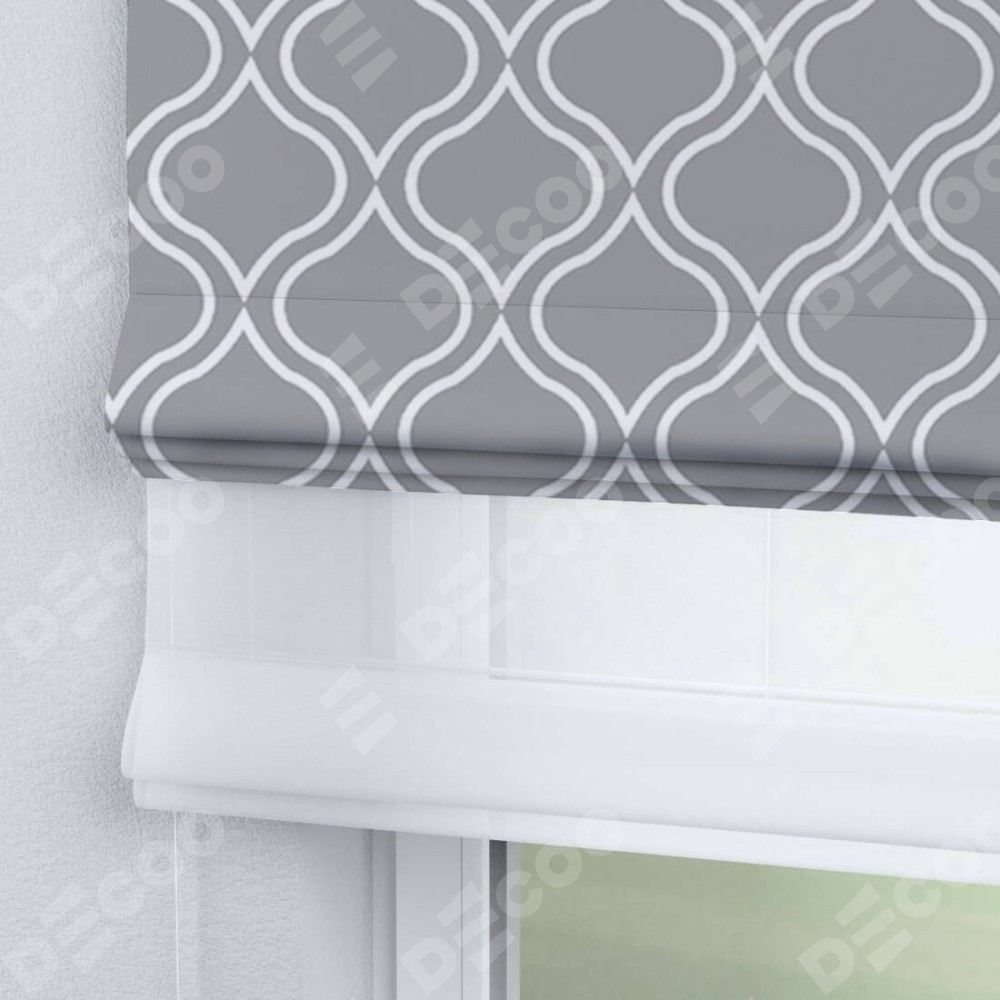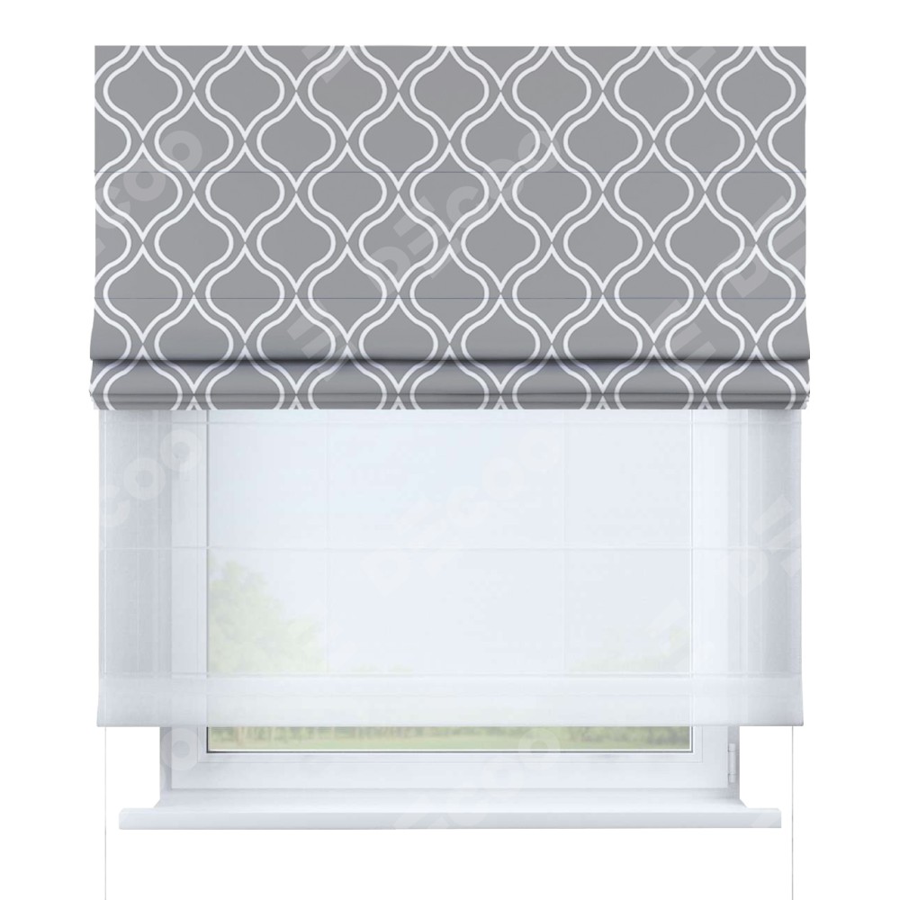 Римская штора день-ночь производителя «Cortin», используется для проёма, пошита из двух полотен, с лицевой блэкаут с нанесением сублимационной печати «Тайны востока серый», вторая ткань тюль (по стандарту комплектуется тюль белого цвета артикул V-01). Имеет универсальный механизм и подходит для монтажа: на потолок, на стену и в нишу.