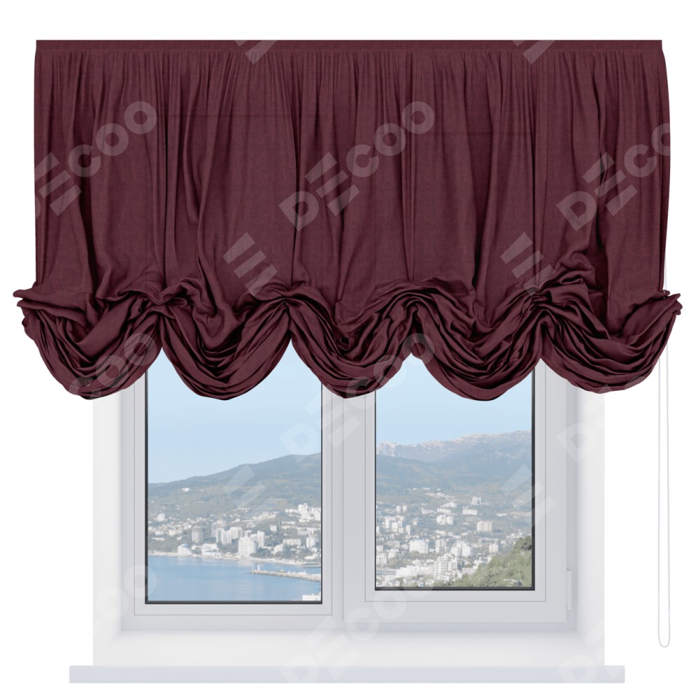 Австрийская штора производителя «Cortin», используется для проёма, пошита из ткани лён кашемир бордовый, артикул ткани 17213. Имеет универсальный механизм и подходит для монтажа: на потолок и на стену.