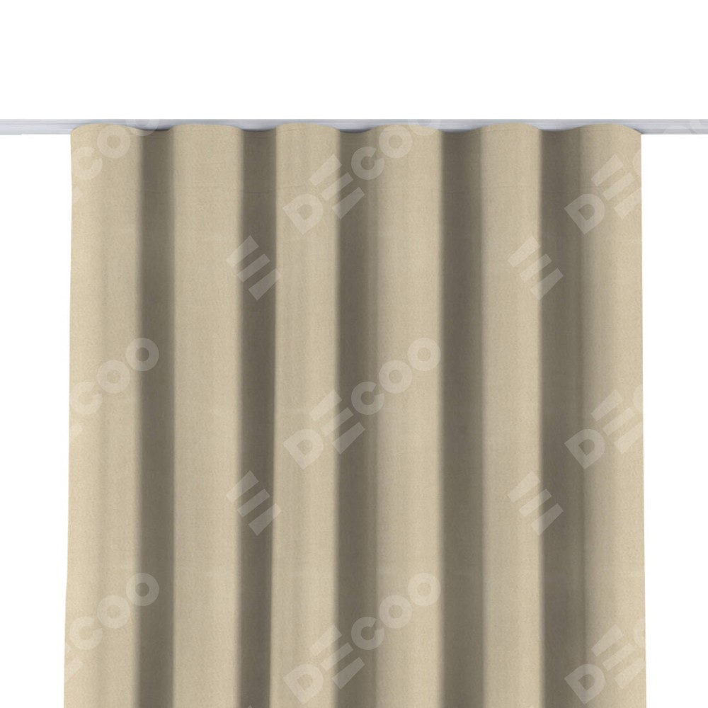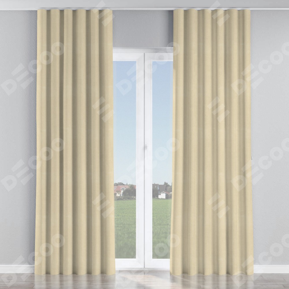 Комплект прямых штор, от производителя «Cortin», пошиты из ткани блэкаут однотонный бежевый, артикул ткани 13125. С изнаночной стороны в верхней части штор пристрачивается шторная лента с декоративными складками «Волна». Для создания элегантных складок прямые шторы шьются по стандарту с коэффициентом 1:2 (на 100 см. ширины проёма 200 см. ширины ткани).