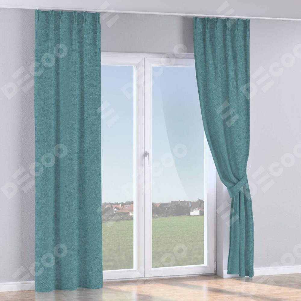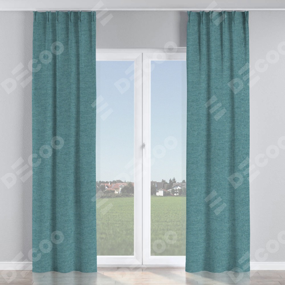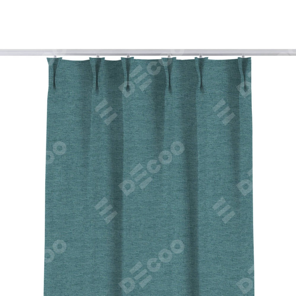 Комплект прямых штор, от производителя «Cortin», пошиты из ткани стиф димаут бирюзовый, артикул ткани 18196. С изнаночной стороны в верхней части штор пристрачивается шторная лента с декоративными складками «Кустик». Для создания элегантных складок прямые шторы шьются по стандарту с коэффициентом 1:2 (на 100 см. ширины проёма 200 см. ширины ткани).