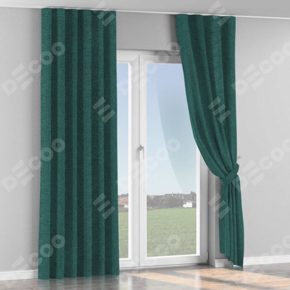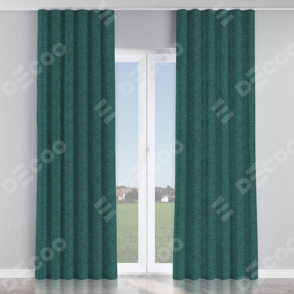 Комплект прямых штор, от производителя «Cortin», пошиты из ткани стиф димаут сине-зелёный, артикул ткани 18194. С изнаночной стороны в верхней части штор пристрачивается шторная лента с декоративными складками «Волна». Для создания элегантных складок прямые шторы шьются по стандарту с коэффициентом 1:2 (на 100 см. ширины проёма 200 см. ширины ткани).