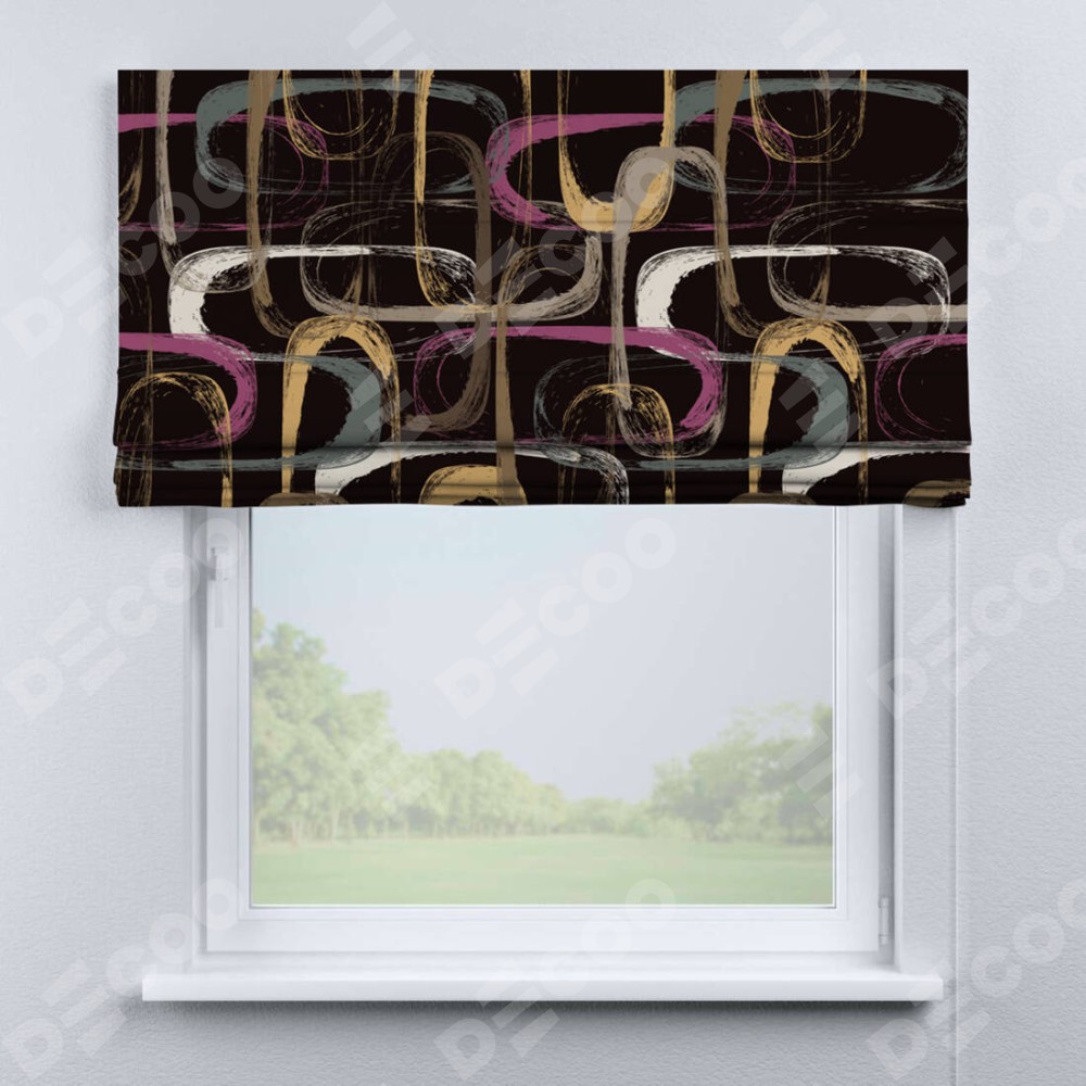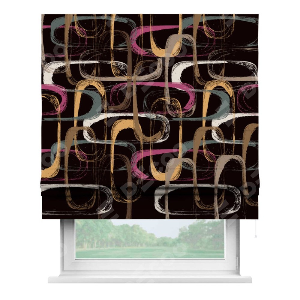 Римская штора производителя «Cortin», используется для проёма, пошита из ткани блэкаут с нанесением сублимационной печати «Тёмная палитра». Имеет универсальный механизм и подходит для монтажа: на потолок, на стену и в нишу.
