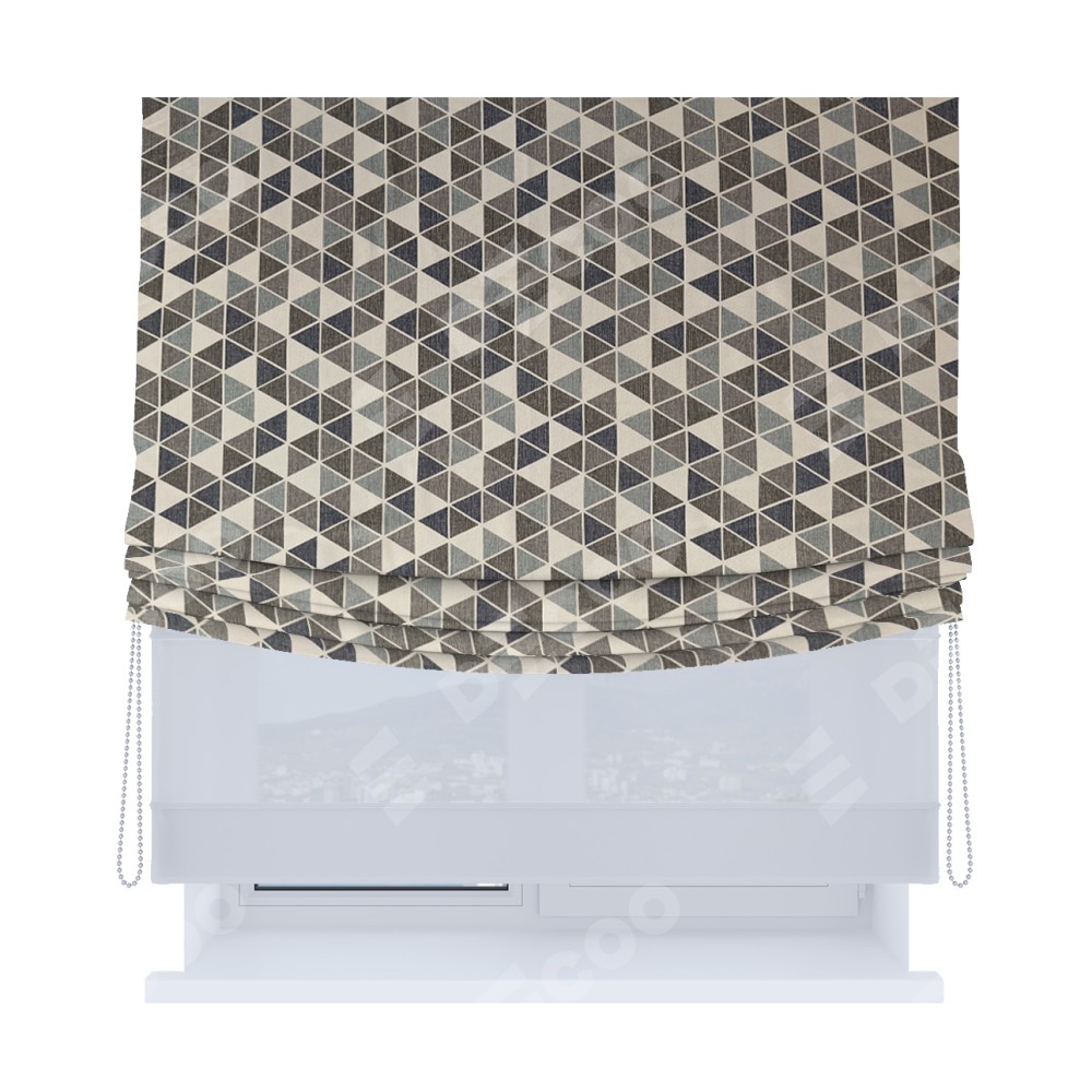Римская штора день-ночь производителя «Cortin», используется для проёма, пошита из двух полотен, с лицевой стороны димаут «Треугольники синие» артикул 23022, вторая ткань тюль (по стандарту комплектуется тюль белого цвета артикул V-01). Имеет универсальный механизм и подходит для монтажа: на потолок, на стену и в нишу. Удобное управление каждой шторой отдельно.