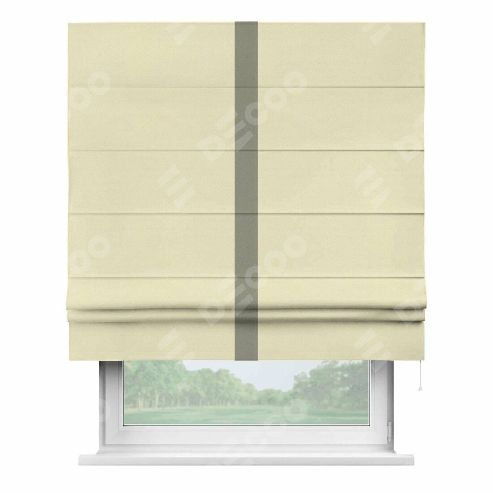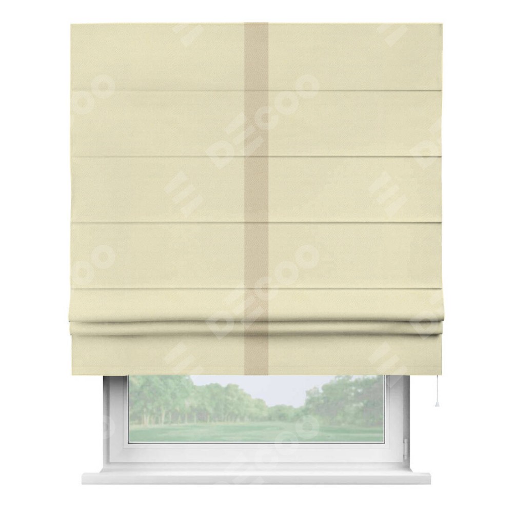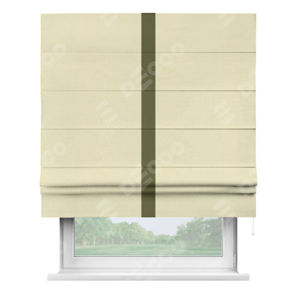Римская штора производителя «Cortin», используется для проёма, пошита из ткани блэкаут однотонный бежевый, артикул ткани 88283. Отделка шторы кантом «Хайвей», ткань для канта используется из блэкаута однотонного разной расцветки на выбор. Имеет универсальный механизм и подходит для монтажа: на потолок, на стену и в нишу.