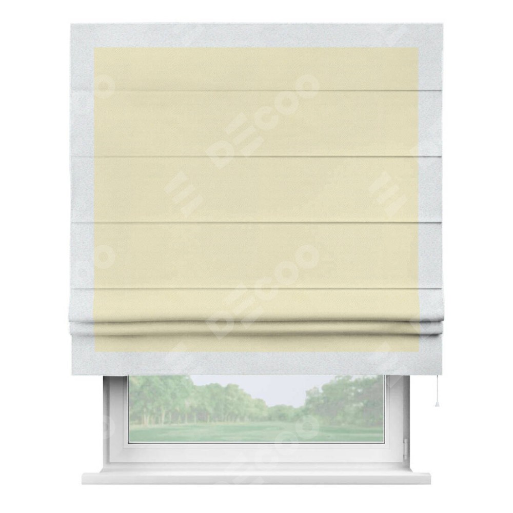 Римская штора производителя «Cortin», используется для проёма, пошита из ткани блэкаут однотонный бежевый, артикул ткани 88283. Отделка шторы кантом «Чесс», ткань для канта используется из блэкаута однотонного разной расцветки на выбор. Имеет универсальный механизм и подходит для монтажа: на потолок, на стену и в нишу.