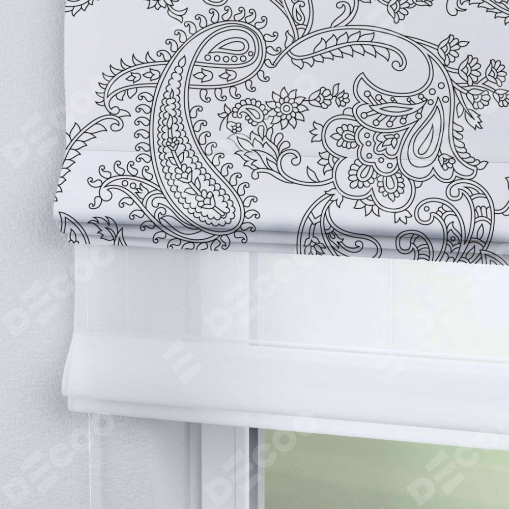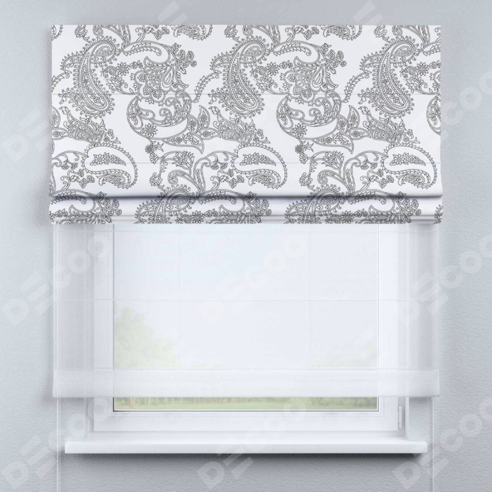 Римская штора день-ночь производителя «Cortin», используется для проёма, пошита из двух полотен, с лицевой блэкаут с нанесением сублимационной печати «Светлый пейсли», вторая ткань тюль (по стандарту комплектуется тюль белого цвета артикул V-01). Имеет универсальный механизм и подходит для монтажа: на потолок, на стену и в нишу.