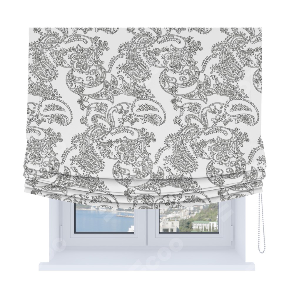 Римская штора Soft производителя «Cortin», используется для проёма, пошита из ткани блэкаут с нанесением сублимационной печати «Светлый пейсли». Имеет универсальный механизм и подходит для монтажа: на потолок, на стену и в нишу. В отличие от стандартных римских штор, римская штора Soft не имеет горизонтальных вставок и нижнего отвеса. Это позволяет ткани произвольно драпироваться в свободные мягкие складки.