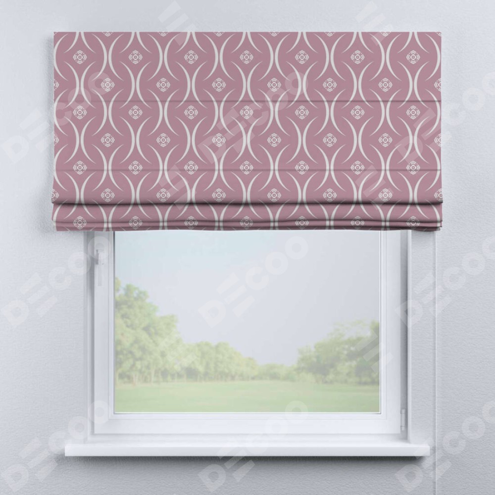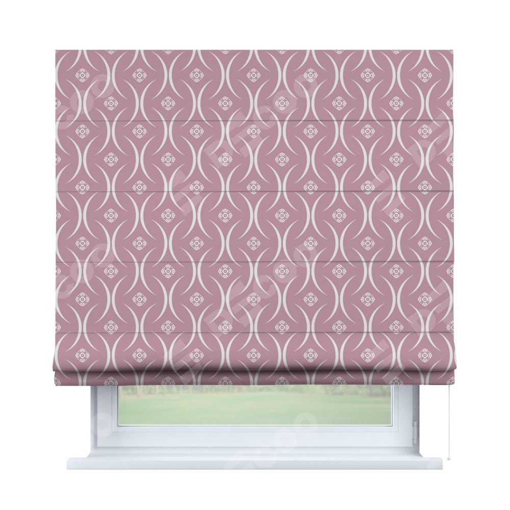 Римская штора производителя «Cortin», используется для проёма, пошита из ткани блэкаут с нанесением сублимационной печати «Воздушный узор розовый». Имеет универсальный механизм и подходит для монтажа: на потолок, на стену и в нишу.