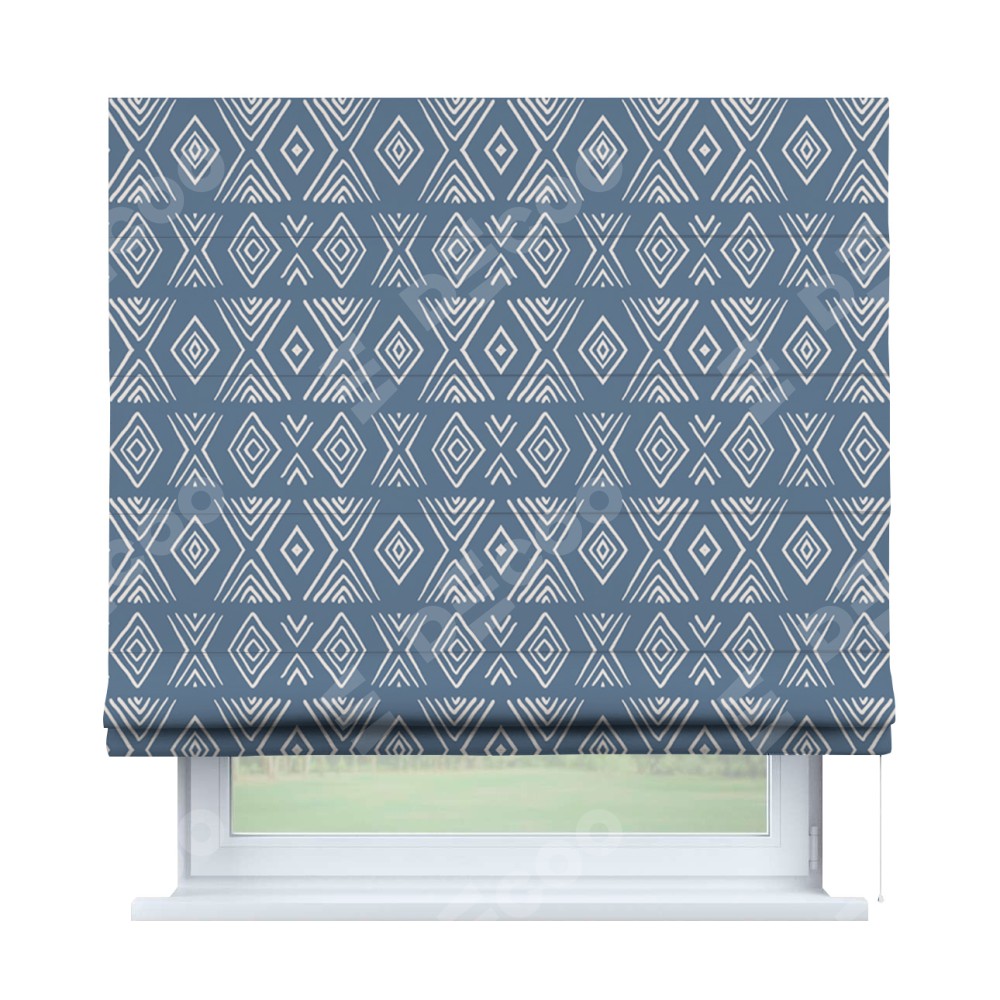 Римская штора производителя «Cortin», используется для проёма, пошита из ткани блэкаут с нанесением сублимационной печати «Графический орнамент». Имеет универсальный механизм и подходит для монтажа: на потолок, на стену и в нишу.