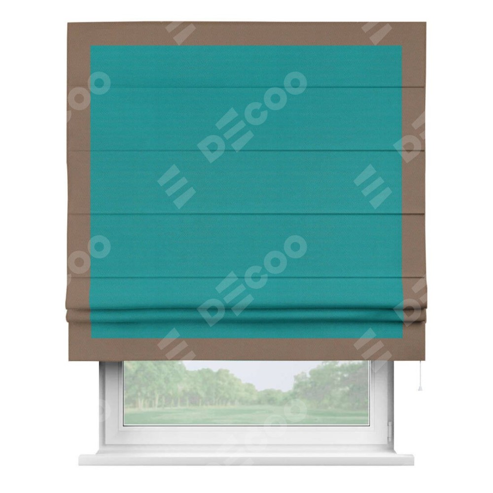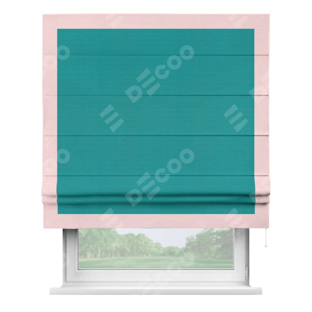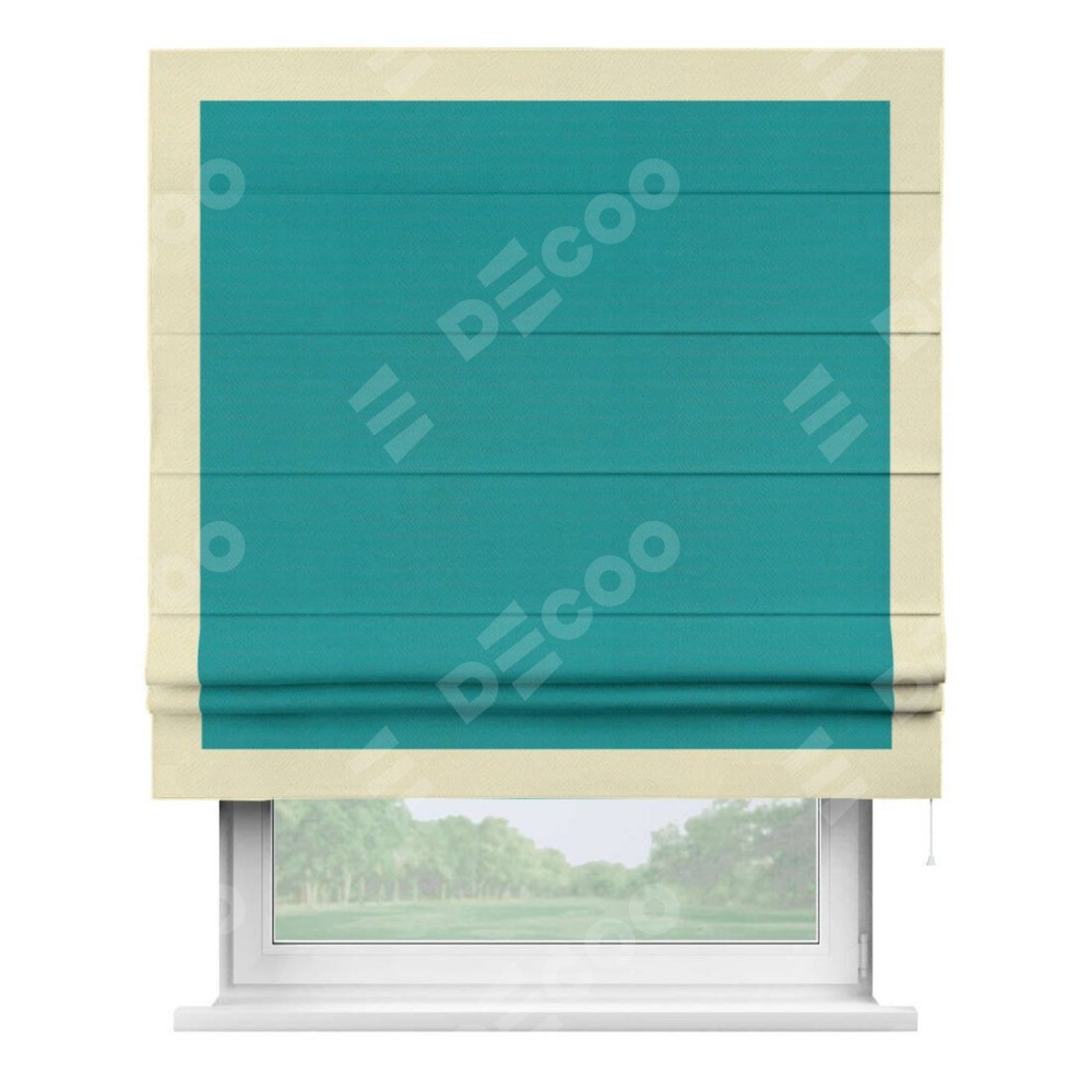 Римская штора производителя «Cortin», используется для проёма, пошита из ткани блэкаут однотонный бирюзовый, артикул ткани 88297. Отделка шторы кантом «Чесс», ткань для канта используется из блэкаута однотонного разной расцветки на выбор. Имеет универсальный механизм и подходит для монтажа: на потолок, на стену и в нишу.