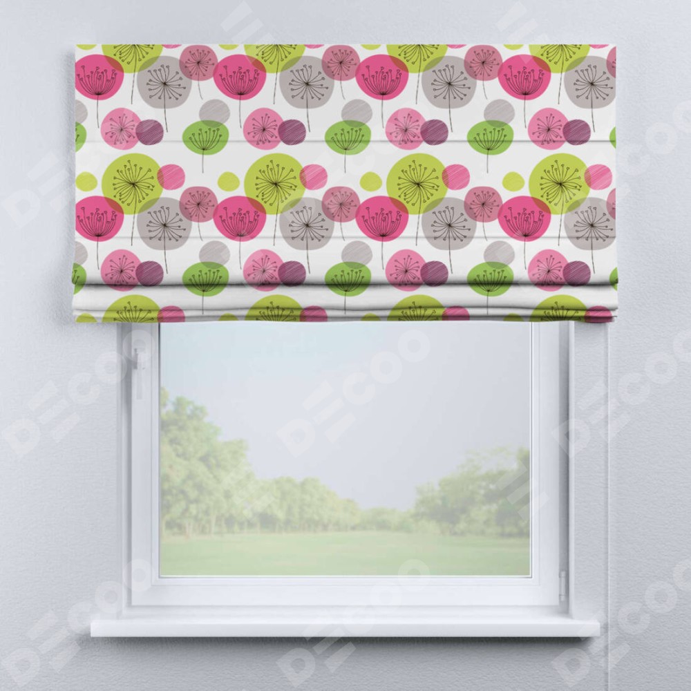 Римская штора производителя «Cortin», используется для проёма, пошита из ткани блэкаут с нанесением сублимационной печати «Цветные одуванчики». Имеет универсальный механизм и подходит для монтажа: на потолок, на стену и в нишу.