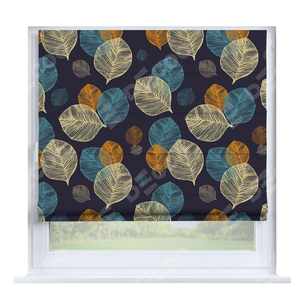 Римская штора производителя «Cortin», устанавливается на створку окна, пошита из ткани блэкаут с нанесением сублимационной печати «Листья в ночи». Штора шьётся по индивидуальным размерам, для данного типа римской шторы возможная ширина от 35 до 150 см., высота до 250 см.