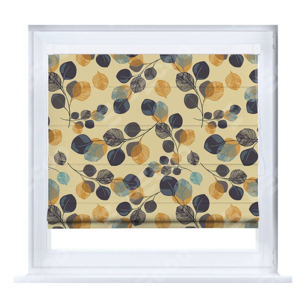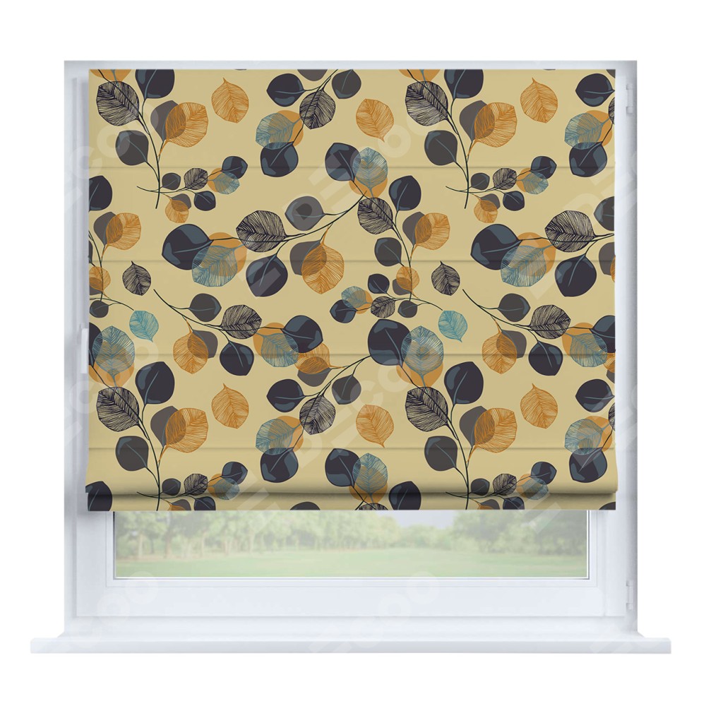 Римская штора «Кортин» на створку «Листья в янтаре» отлично подойдёт для интерьера: в кухню, в гостиную и на балкон.