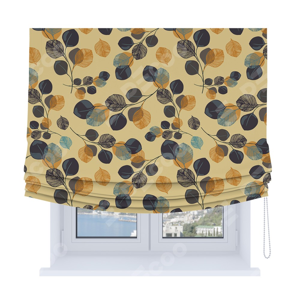 Римская штора Soft производителя «Cortin», используется для проёма, пошита из ткани блэкаут с нанесением сублимационной печати «Листья в янтаре». Имеет универсальный механизм и подходит для монтажа: на потолок, на стену и в нишу. В отличие от стандартных римских штор, римская штора Soft не имеет горизонтальных вставок и нижнего отвеса. Это позволяет ткани произвольно драпироваться в свободные мягкие складки.