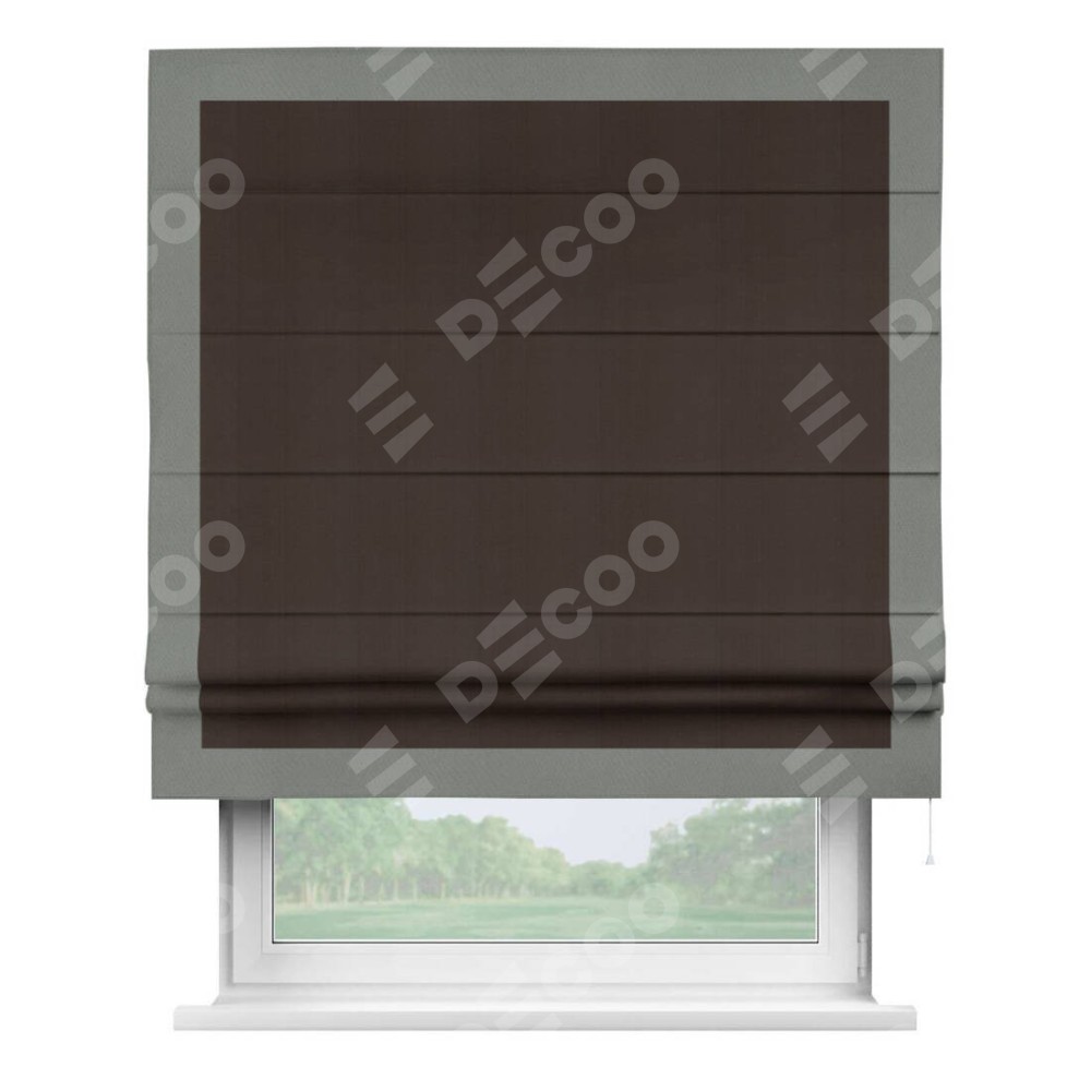 Римская штора производителя «Cortin», используется для проёма, пошита из ткани блэкаут однотонный венге, артикул ткани 88286. Отделка шторы кантом «Чесс», ткань для канта используется из блэкаута однотонного разной расцветки на выбор. Имеет универсальный механизм и подходит для монтажа: на потолок, на стену и в нишу.