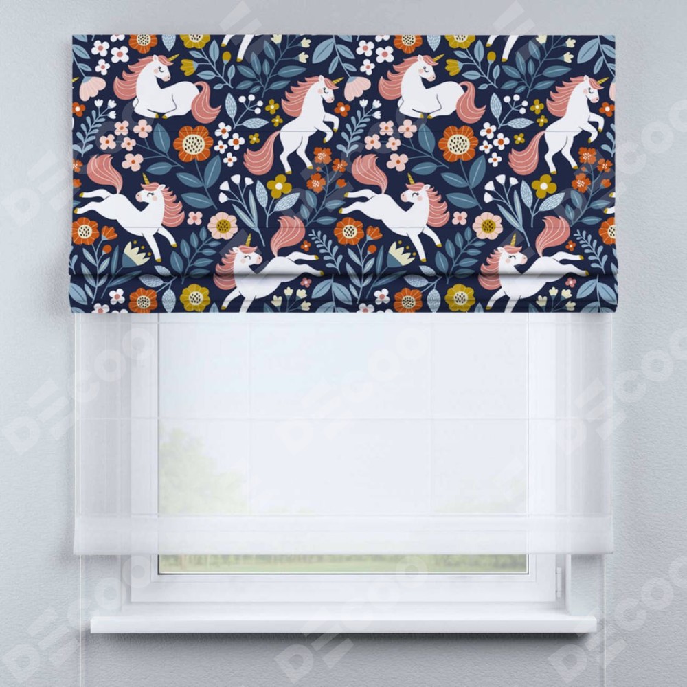 Римская штора день-ночь производителя «Cortin», используется для проёма, пошита из двух полотен, с лицевой блэкаут с нанесением сублимационной печати «Цветы и единороги», вторая ткань тюль (по стандарту комплектуется тюль белого цвета артикул V-01). Имеет универсальный механизм и подходит для монтажа: на потолок, на стену и в нишу.