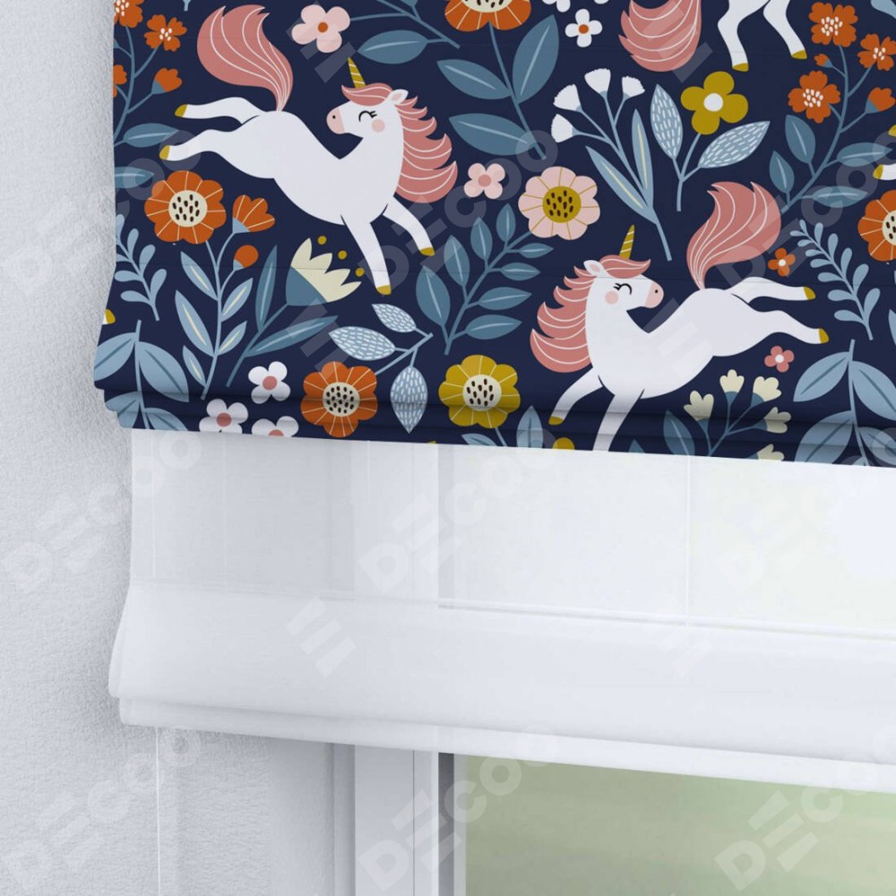 Римская штора «Кортин» день-ночь «Цветы и единороги» отлично подойдёт для интерьера: в детскую.