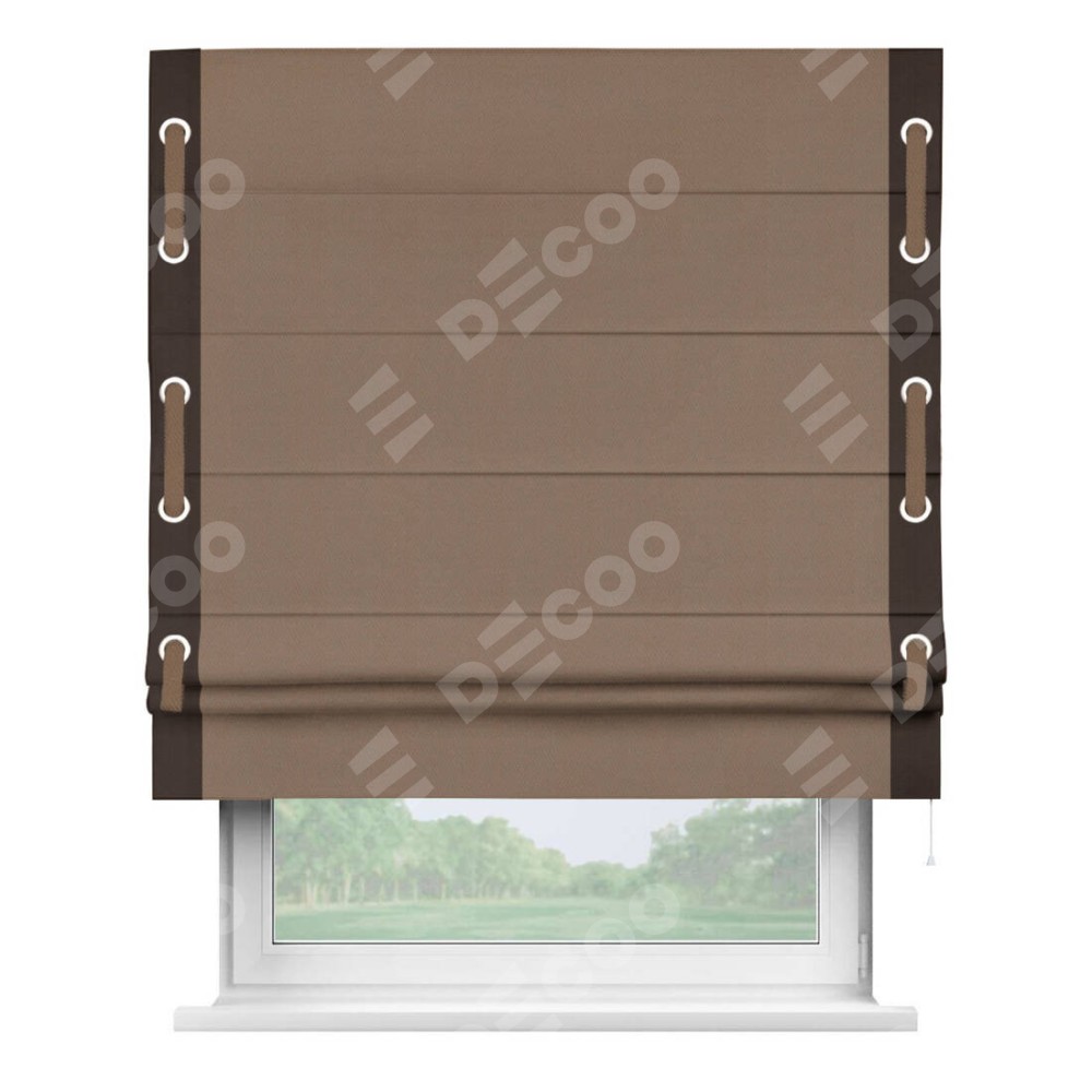 Римская штора производителя «Cortin», используется для проёма, пошита из ткани блэкаут однотонный коричневый, артикул ткани 88285. Отделка шторы кантом «Стрим Дуо» на кантах расположены люверсы с пояском, ткань для канта используется из блэкаута однотонного разной расцветки на выбор. Ткань для пояска обычно используется из основной ткани шторы, а так же можно сделать из любой расцветки по желанию. Имеет универсальный механизм и подходит для монтажа: на потолок, на стену и в нишу.