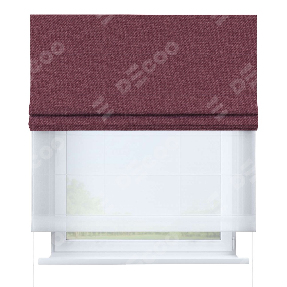 Римская штора день-ночь производителя «Cortin», используется для проёма, пошита из двух полотен, с лицевой стороны лён димаут марсала артикул 1602, вторая ткань тюль (по стандарту комплектуется тюль белого цвета артикул V-01). Имеет универсальный механизм и подходит для монтажа: на потолок, на стену и в нишу.