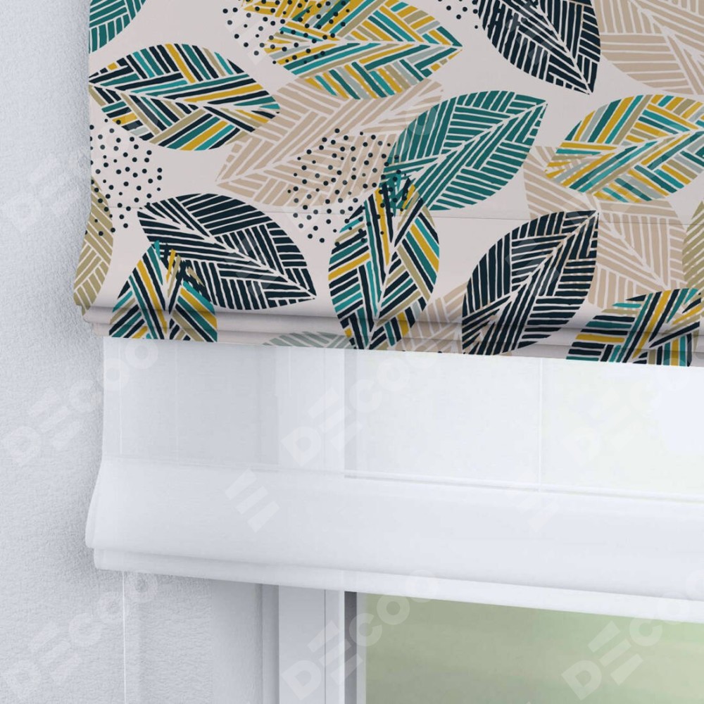 Римская штора день-ночь производителя «Cortin», используется для проёма, пошита из двух полотен, с лицевой блэкаут с нанесением сублимационной печати «Листья с орнаментом», вторая ткань тюль (по стандарту комплектуется тюль белого цвета артикул V-01). Имеет универсальный механизм и подходит для монтажа: на потолок, на стену и в нишу.