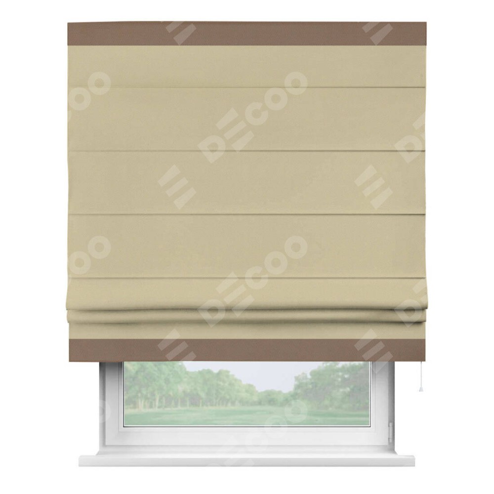 Римская штора производителя «Cortin», используется для проёма, пошита из ткани блэкаут однотонный кофейный, артикул ткани 13130. Отделка шторы кантом «Горизонт», ткань для канта используется из блэкаута однотонного разной расцветки на выбор. Имеет универсальный механизм и подходит для монтажа: на потолок, на стену и в нишу.