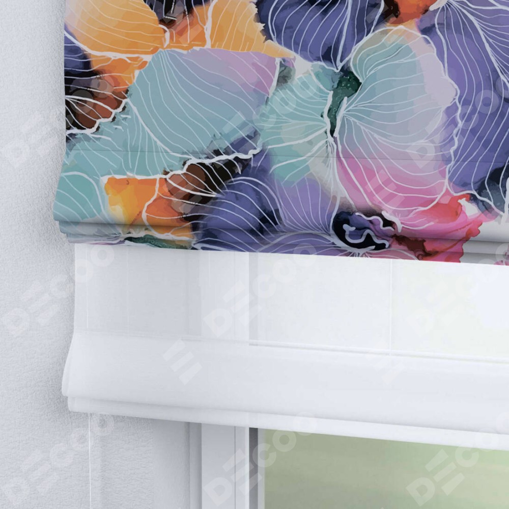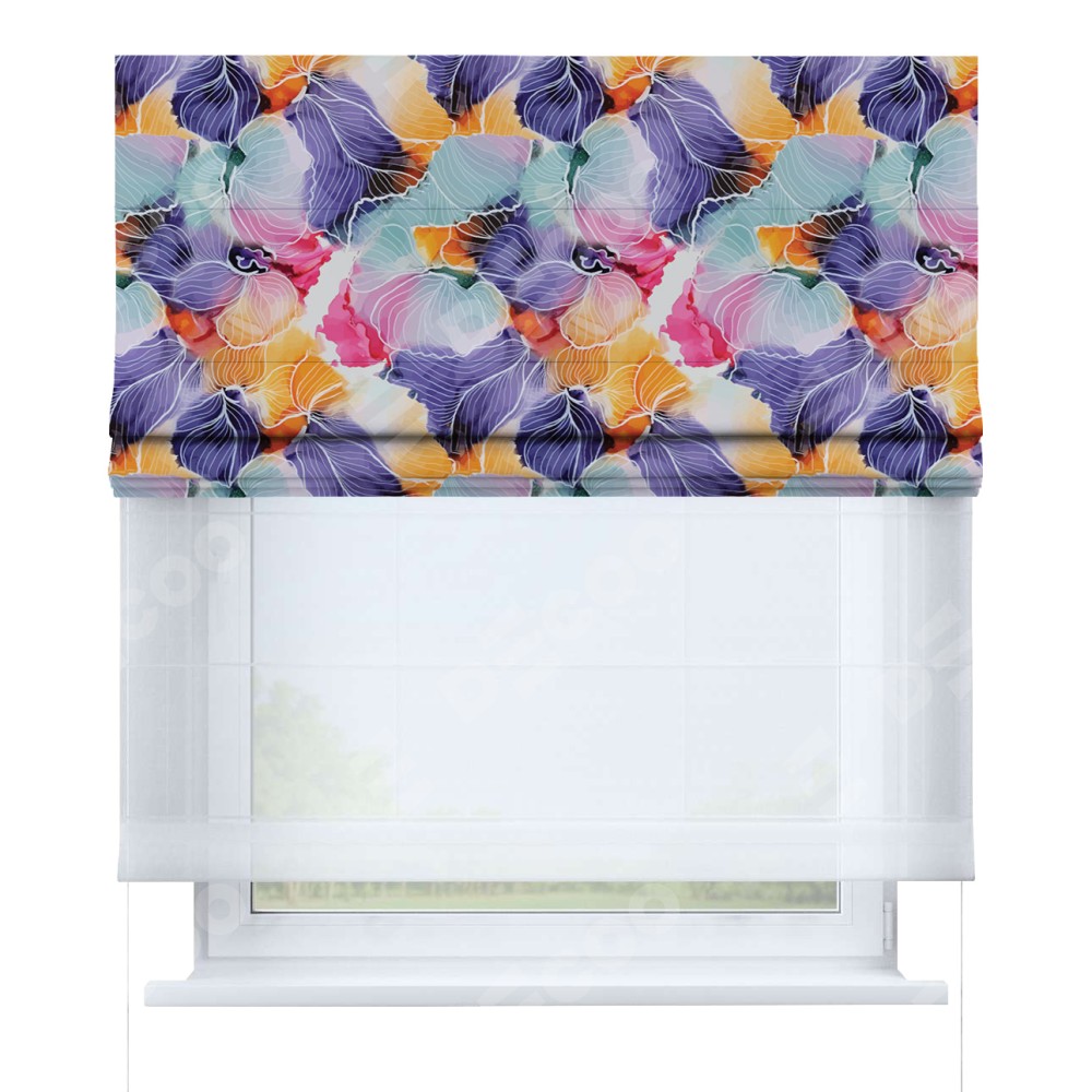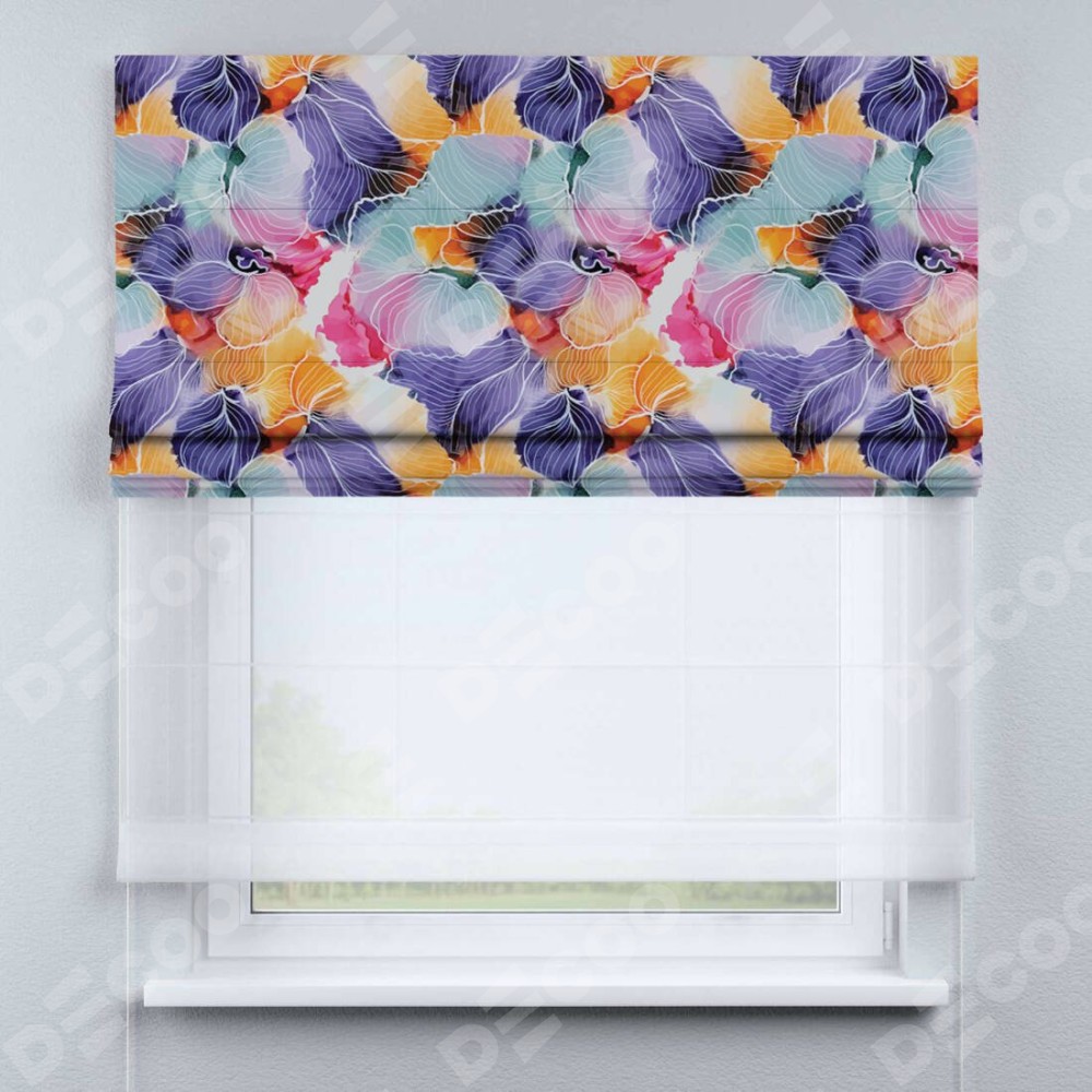 Римская штора день-ночь производителя «Cortin», используется для проёма, пошита из двух полотен, с лицевой блэкаут с нанесением сублимационной печати «Роскошные ирисы», вторая ткань тюль (по стандарту комплектуется тюль белого цвета артикул V-01). Имеет универсальный механизм и подходит для монтажа: на потолок, на стену и в нишу.