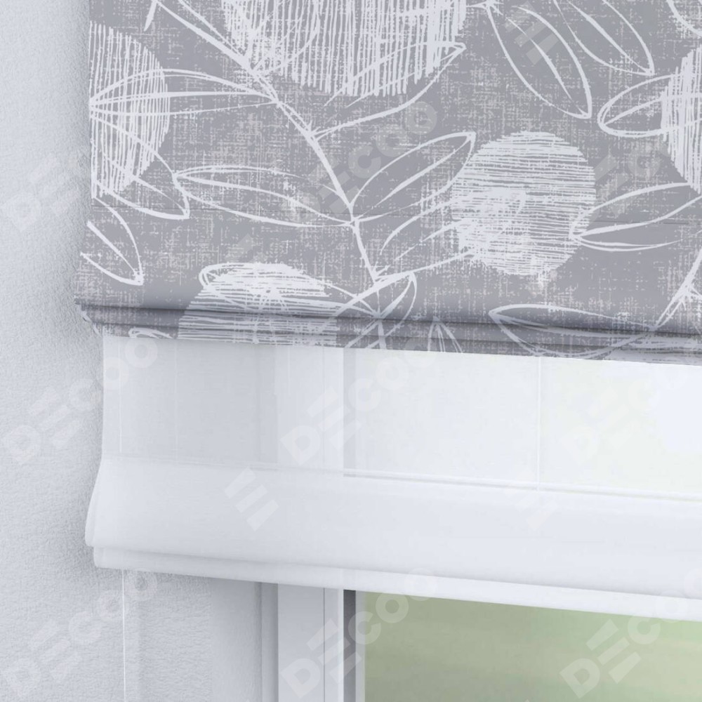 Римская штора день-ночь производителя «Cortin», используется для проёма, пошита из двух полотен, с лицевой блэкаут с нанесением сублимационной печати «Серо-белая фантазия», вторая ткань тюль (по стандарту комплектуется тюль белого цвета артикул V-01). Имеет универсальный механизм и подходит для монтажа: на потолок, на стену и в нишу.
