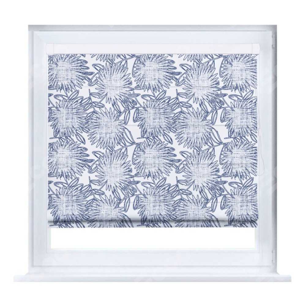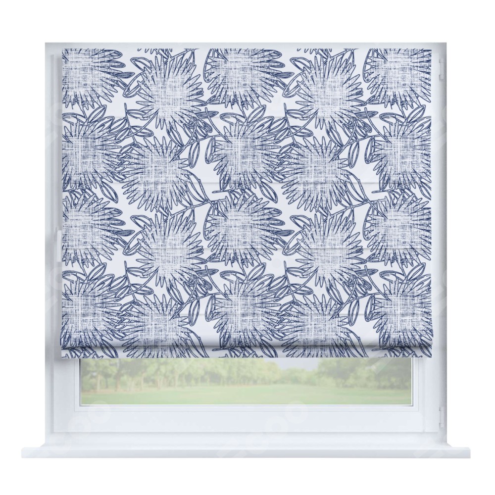 Римская штора производителя «Cortin», устанавливается на створку окна, пошита из ткани блэкаут с нанесением сублимационной печати «Синий букет». Штора шьётся по индивидуальным размерам, для данного типа римской шторы возможная ширина от 35 до 150 см., высота до 250 см.