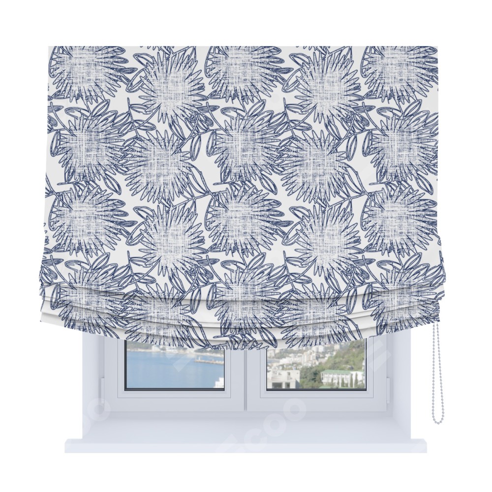Римская штора Soft производителя «Cortin», используется для проёма, пошита из ткани блэкаут с нанесением сублимационной печати «Синий букет». Имеет универсальный механизм и подходит для монтажа: на потолок, на стену и в нишу. В отличие от стандартных римских штор, римская штора Soft не имеет горизонтальных вставок и нижнего отвеса. Это позволяет ткани произвольно драпироваться в свободные мягкие складки.